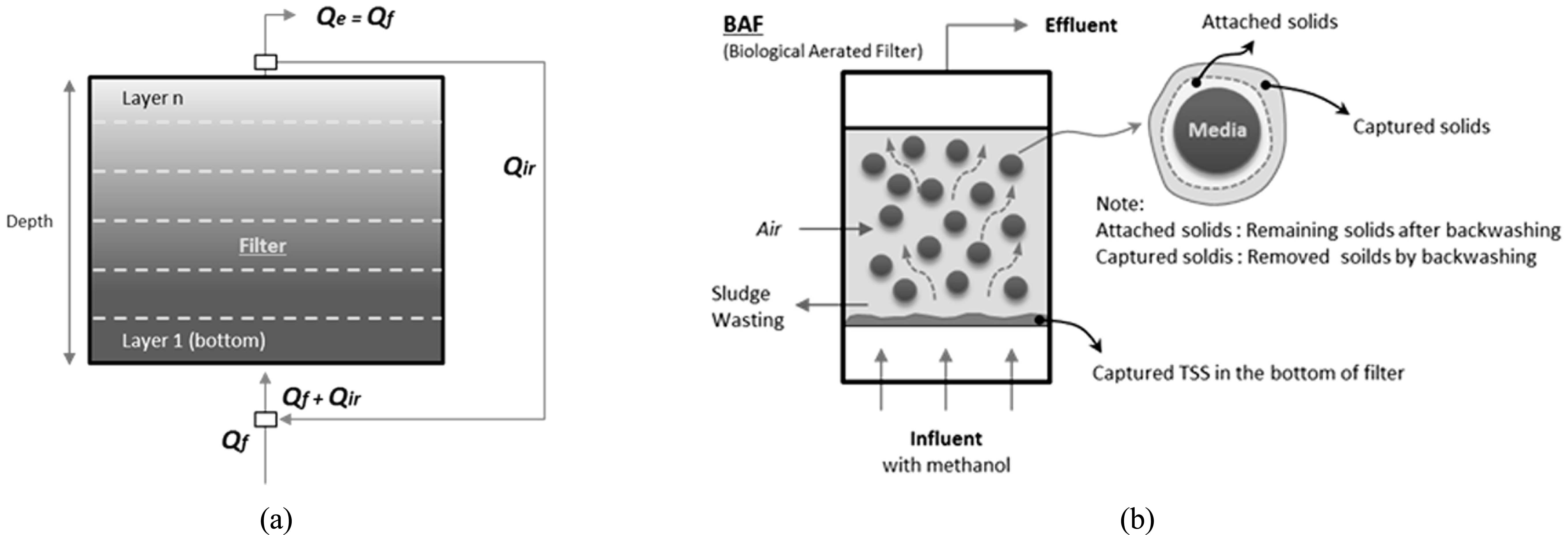Fig. 1. Schematic diagram of BAF for modelling (a) and the concept of suspended solids removal by media (b).