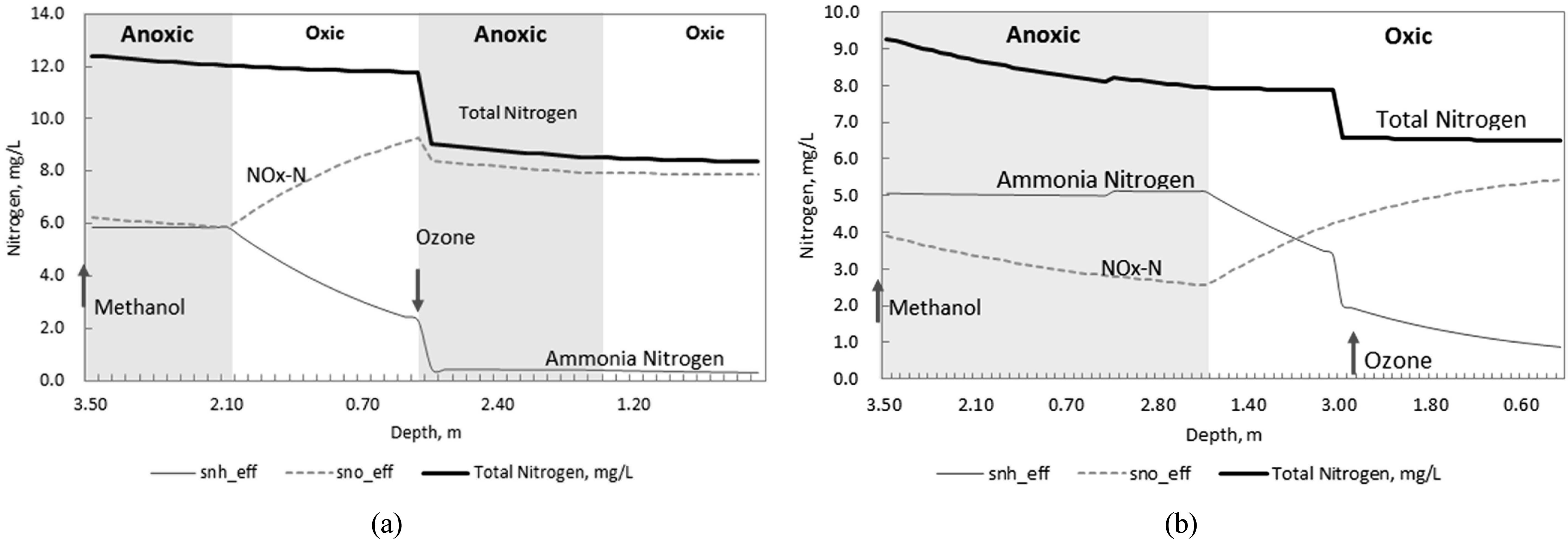 오존 추가에 따른 탈질 방해를 최소화하기 위하여 BAF-B 는 탈질 없이 질산화 공정만으로 운전하는 것으로 시뮬레 이션 하였다(Fig. 10(b)). 내부반송의 경우에도 변경된 운전 조건에 따라 BAF-A2에서 BAF-A1으로 연결된 배관을 BAF-B에서 BAF-A1으로 연결하였다. BAF-B의 용존산도 농도의 경우 낮은 유기물질 농도를 고려하여 기존 용존산 소 농도인 7 ~ 8 mg/L에 비하여 20 ~ 30% 낮게 유지하는 것으로 시뮬레이션 하였다. 나머지 내부반송, 메탄올, 오존 주입 조건, 유입수 양과 질은 동일한 조건으로 설정하였다.