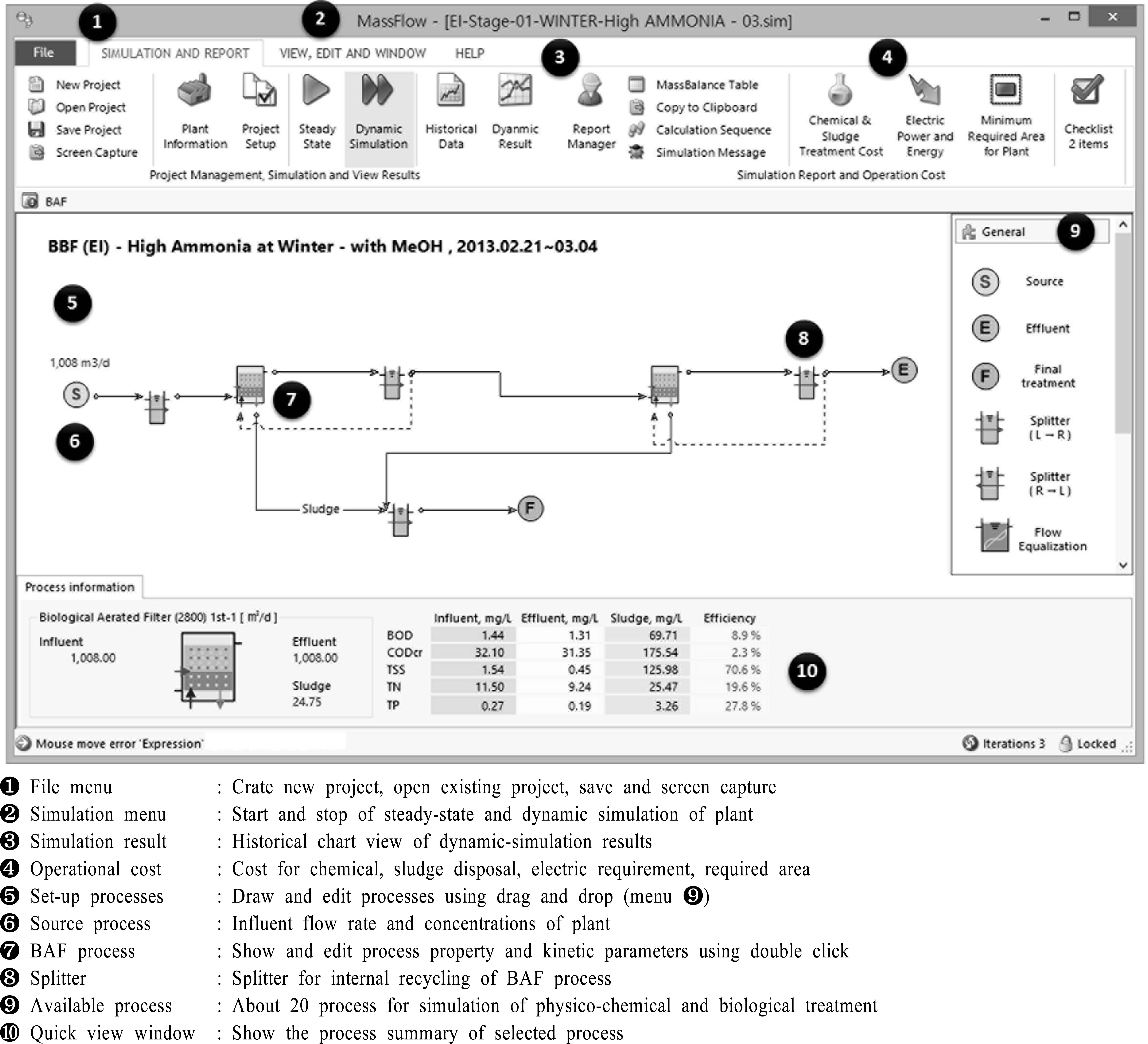 준 경험 모델이 수학적 모델에 비하여 상대적으로 덜 복 잡하지만 많은 수학함수를 반복적인 방법에 의해 계산하여 야 하므로 본 연구에서는 상용 시뮬레이터를 이용하였다. 본 연구에 사용된 시뮬레이터는 MassFlow™ (Fig. 2)로써 ASM No.1 등 다양한 부유성장 공정 및 물리화학적 처리 공정을 정적 및 동적으로 모의할 수 있다. MassFlow™ 는 마이크로소프트 윈도우 XP 이상에서 운영가능하며 생물학 적 영양소 제거공정을 포함한 약 20여 가지의 하수처리공 정을 모사할 수 있다.