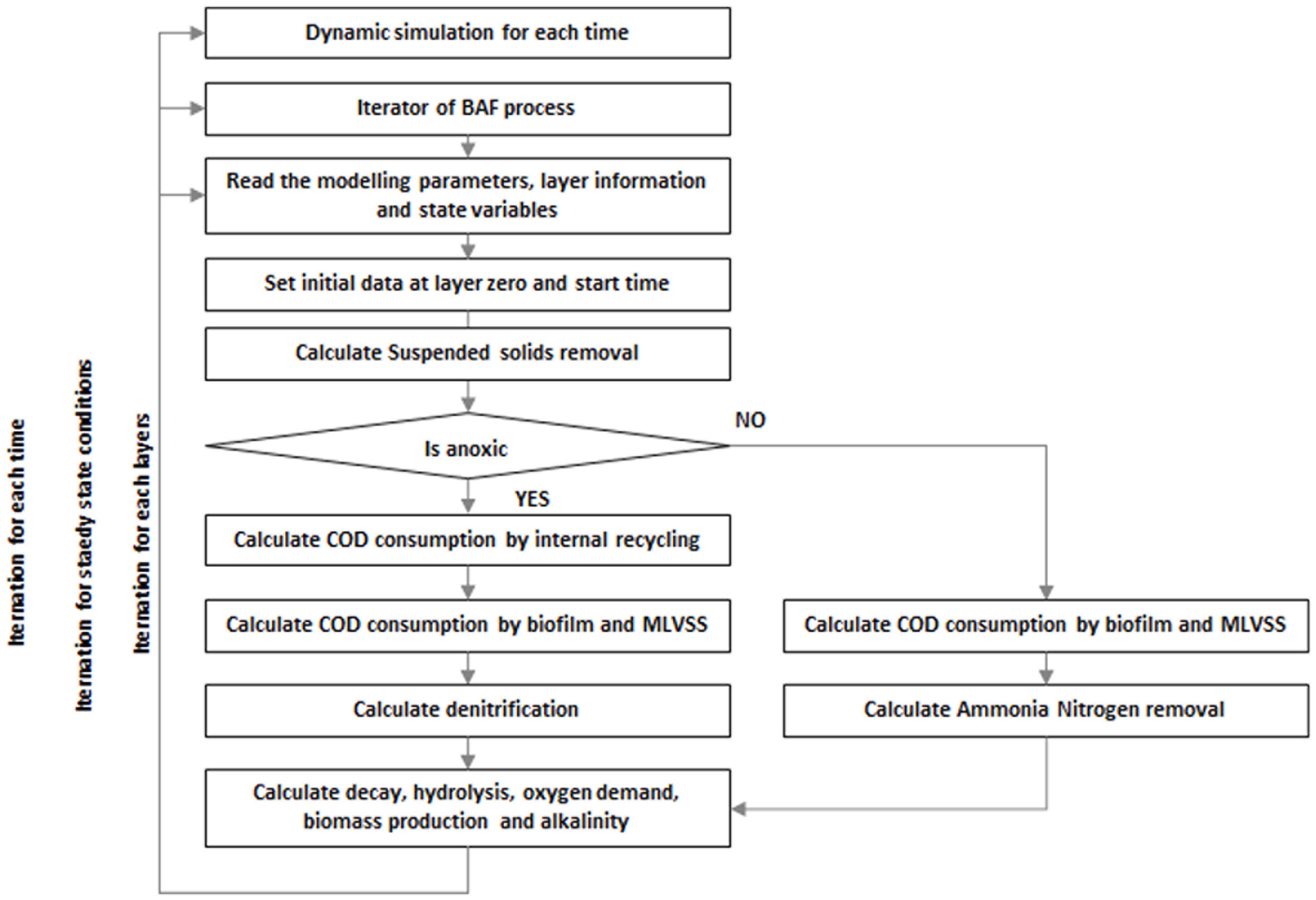 MassFlow™ 에서 BAF 공정 시뮬레이션을 위한 과정은 Fig. 3에서와 같이 총 3개의 반복 수행과정(Iteration)을 포 함한다. 가장 안쪽 반복 수행법은 BAF의 층들(Layers)에 관한 것으로 무산소조와 호기성 조건에 따라 COD(Chemical oxygen demand) 제거, 질산화 및 탈질화 등의 계산을 수행 한다. 또한 BAF 공정이 정상 조건(Steady-state)으로 수렴하 기 위한 반복 수행과정이 포함되어 있으며, 가장 외부의 반복 수행 과정에서는 시간의 변화에 따른 전체 BAF 공정 의 유출수 수질을 시뮬레이션 하였다. 본 연구에서는 파일 럿 플랜트에 설치된 3개의 BAF 공정을 각각 25개의 층으 로 구분하여 정상상태 시뮬레이션을 수행하였다. 또한 정상 상태의 시뮬레이션 결과를 이용하여 보정(Calibration) 하였 고, 전체 운전기간에 대하여 동적 시뮬레이션을 수행하였다.
