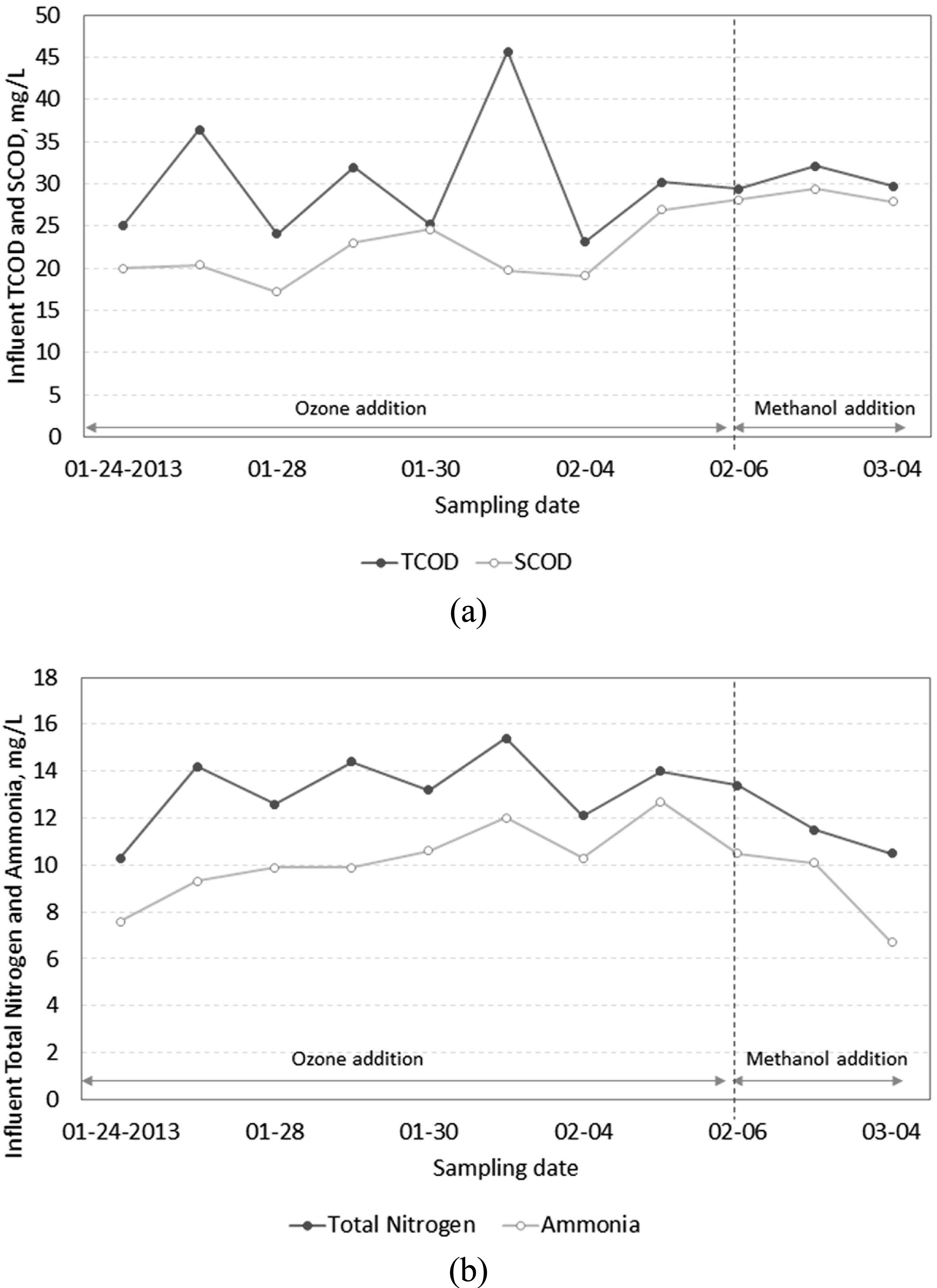 Period Average flow rate (m3/d) Internal recycling (%) Ozone Methanol