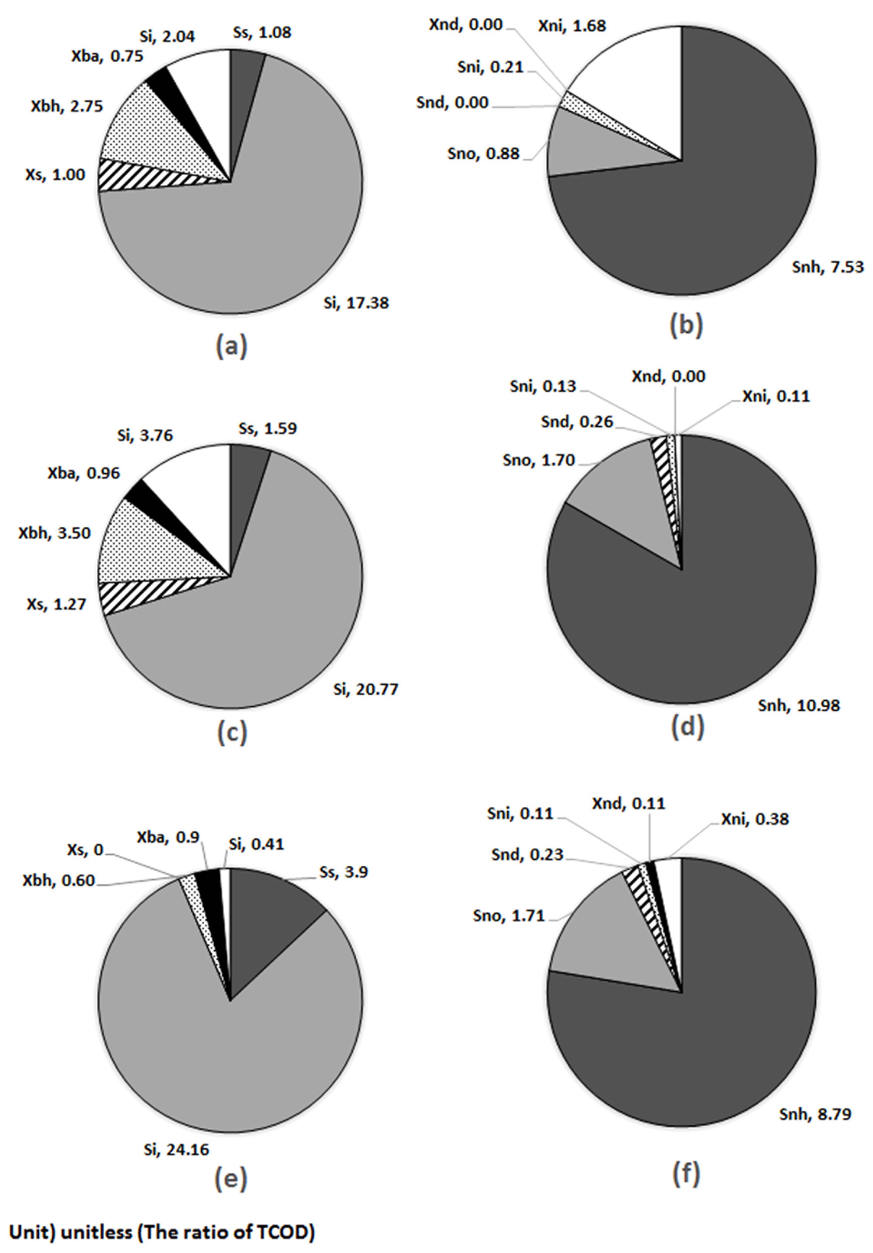 Fig. 5. Influent fraction of COD and nitrogen. (a) COD fraction in period-1, (b) nitrogen fraction in period-1, (c) COD fraction in period-2, (d) nitrogen fraction in period-2, (e) COD fraction in period-3, and (f) nitrogen fraction in period-3.