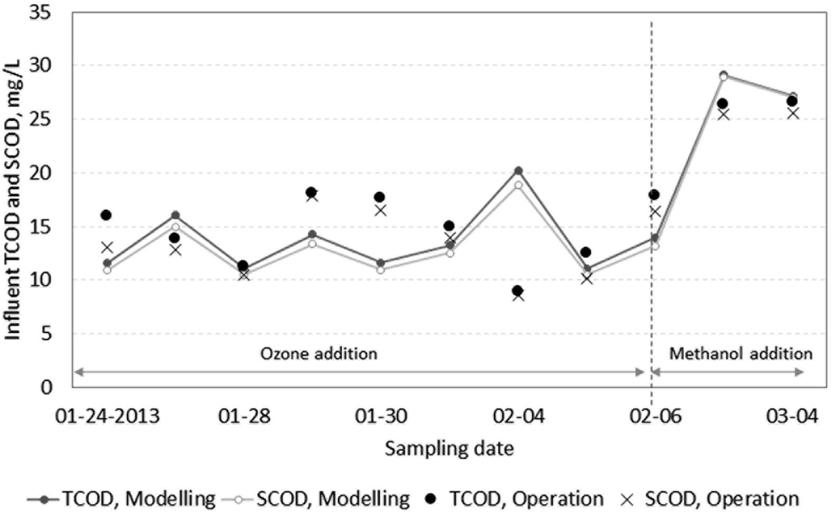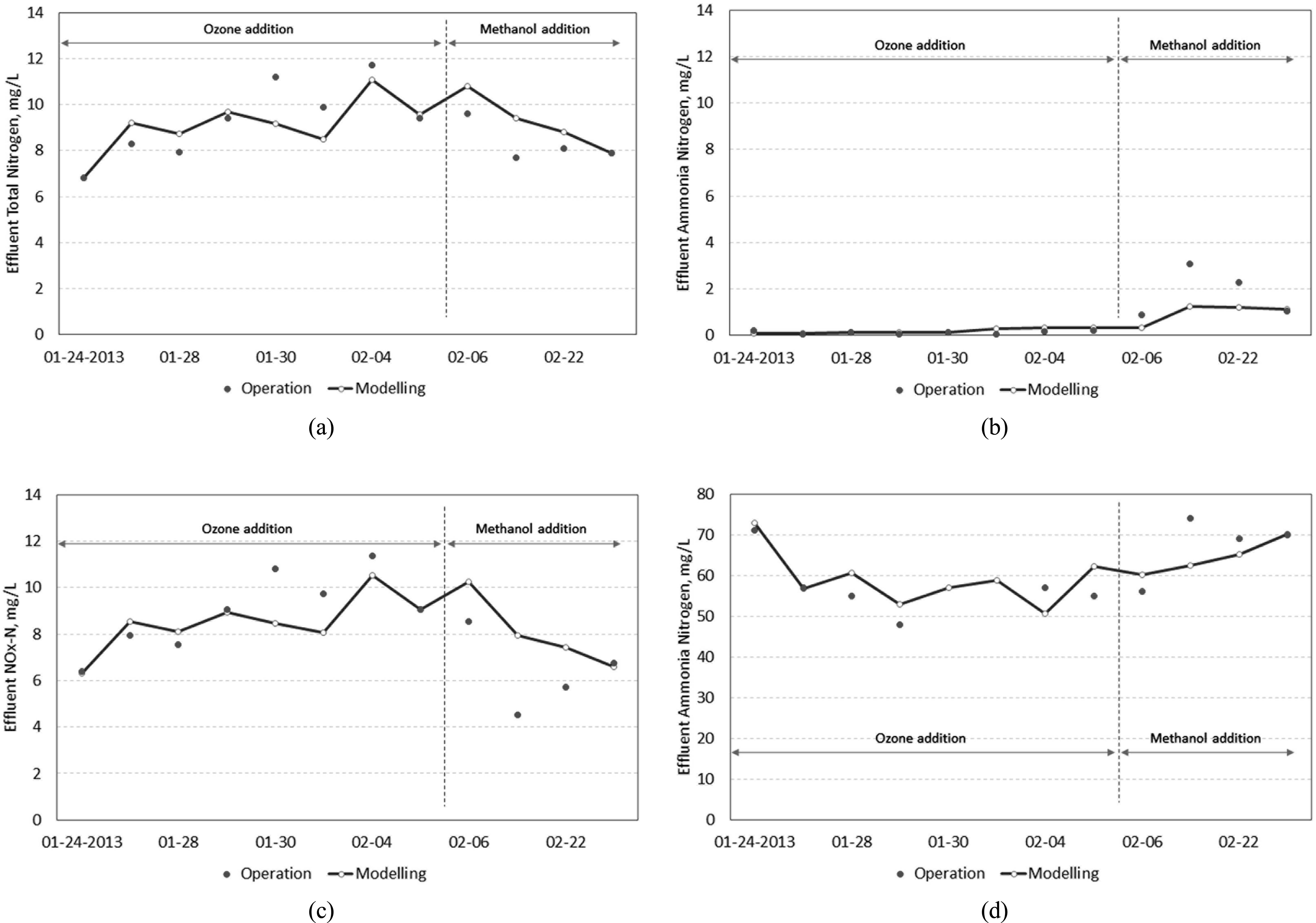 실제 운전 결과와 시뮬레이션 결과를 비교하기 위한 운 전기간은 다음 Table 2에 나타내었다. 첫번째 기간(2013/01/25~01/30)에서는 2단계 BAF (반응조 C)를 운영하지 않 았기 때문에 유입유량을 720 m3/d로 운전하였으며, 2단계 BAF를 운전하기 시작한 두번째 기간(2013/02/01~2013/03/04) 이후부터는 유입유량을 1,008 m3/d로 증가하여 운전하였다. 내부반송율은 전체 운전기간 중 100%에서 200%까지 증가 하여 운전하였으며, 오존은 첫번째와 두번째 기간에 주입하 였고, 메탄올은 세번째 기간만 주입하였다.