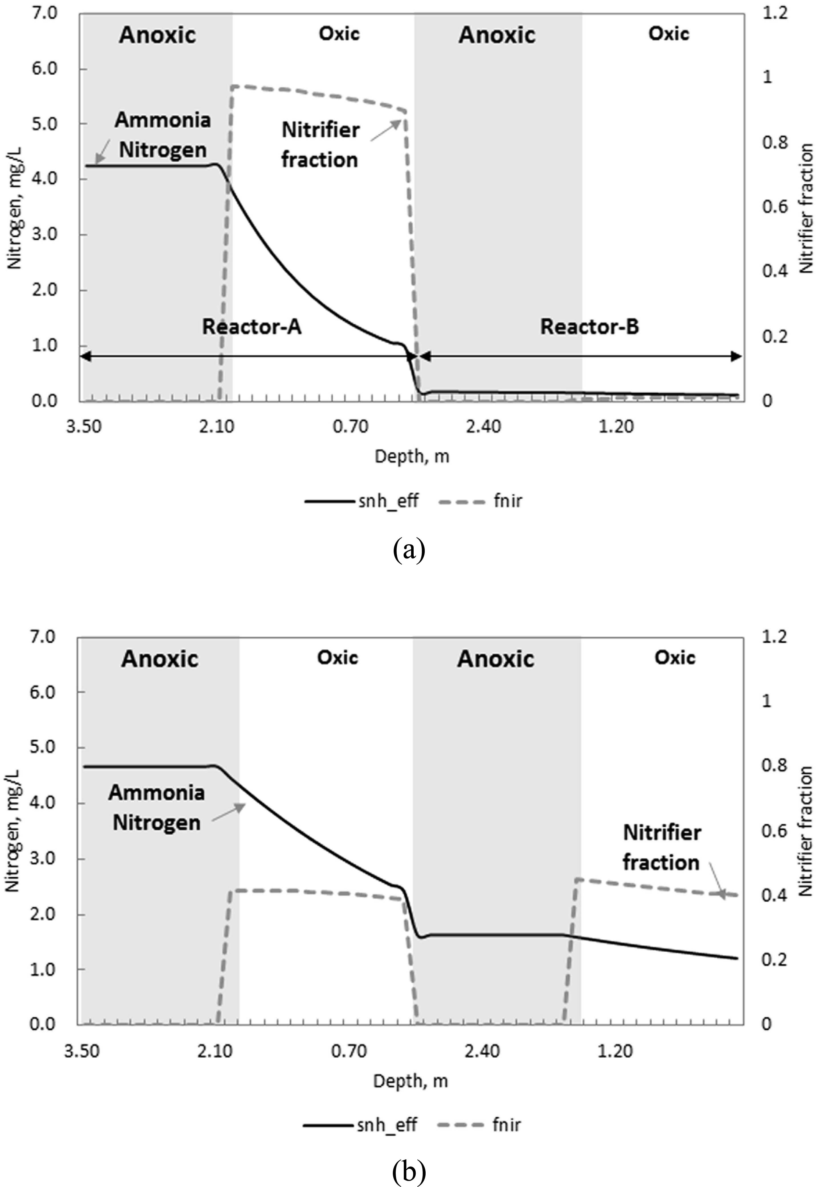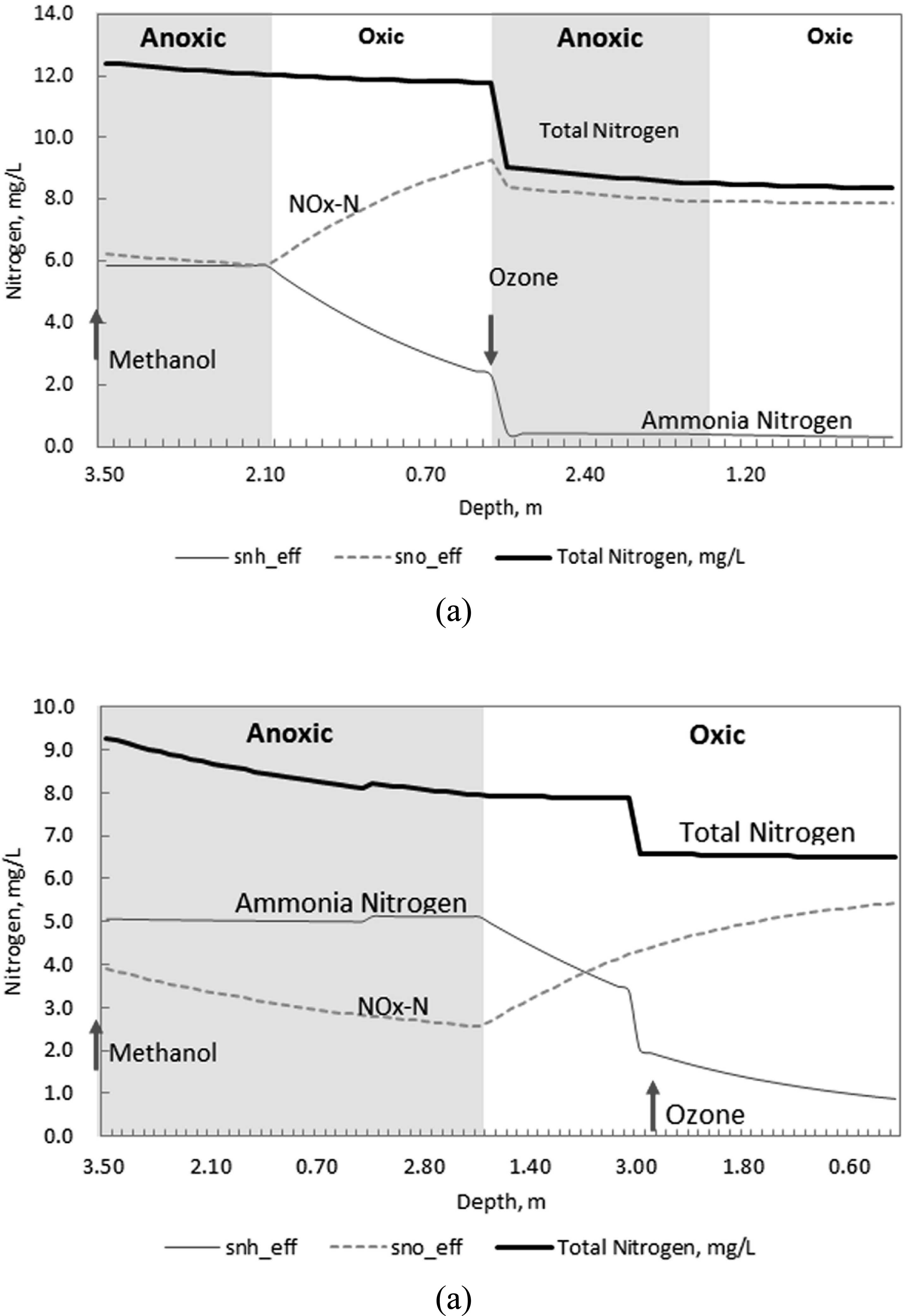 Fig. 11. The comparison of effluent nitrogen profiles between (a) the existing process and (b) the modified process in Period-2.