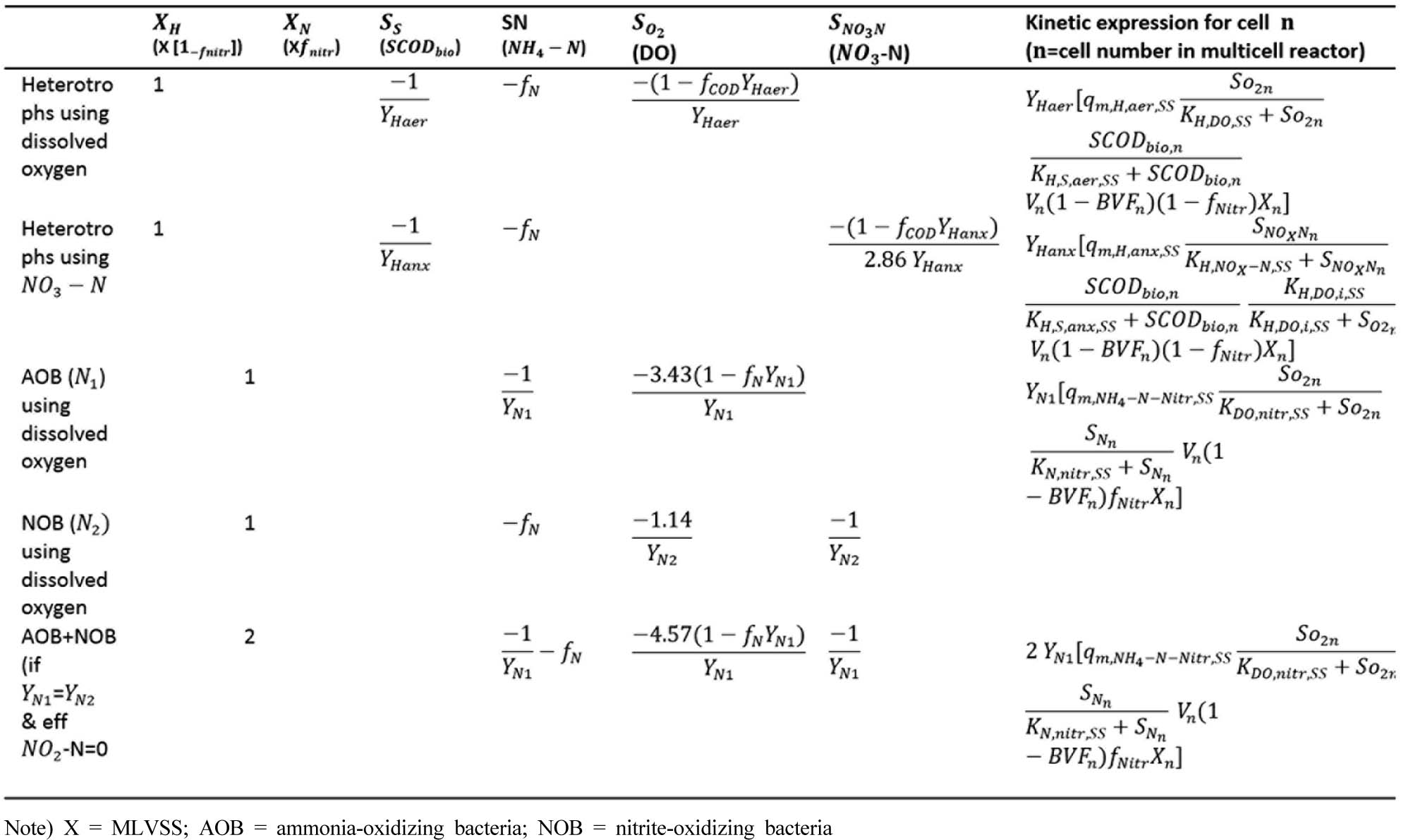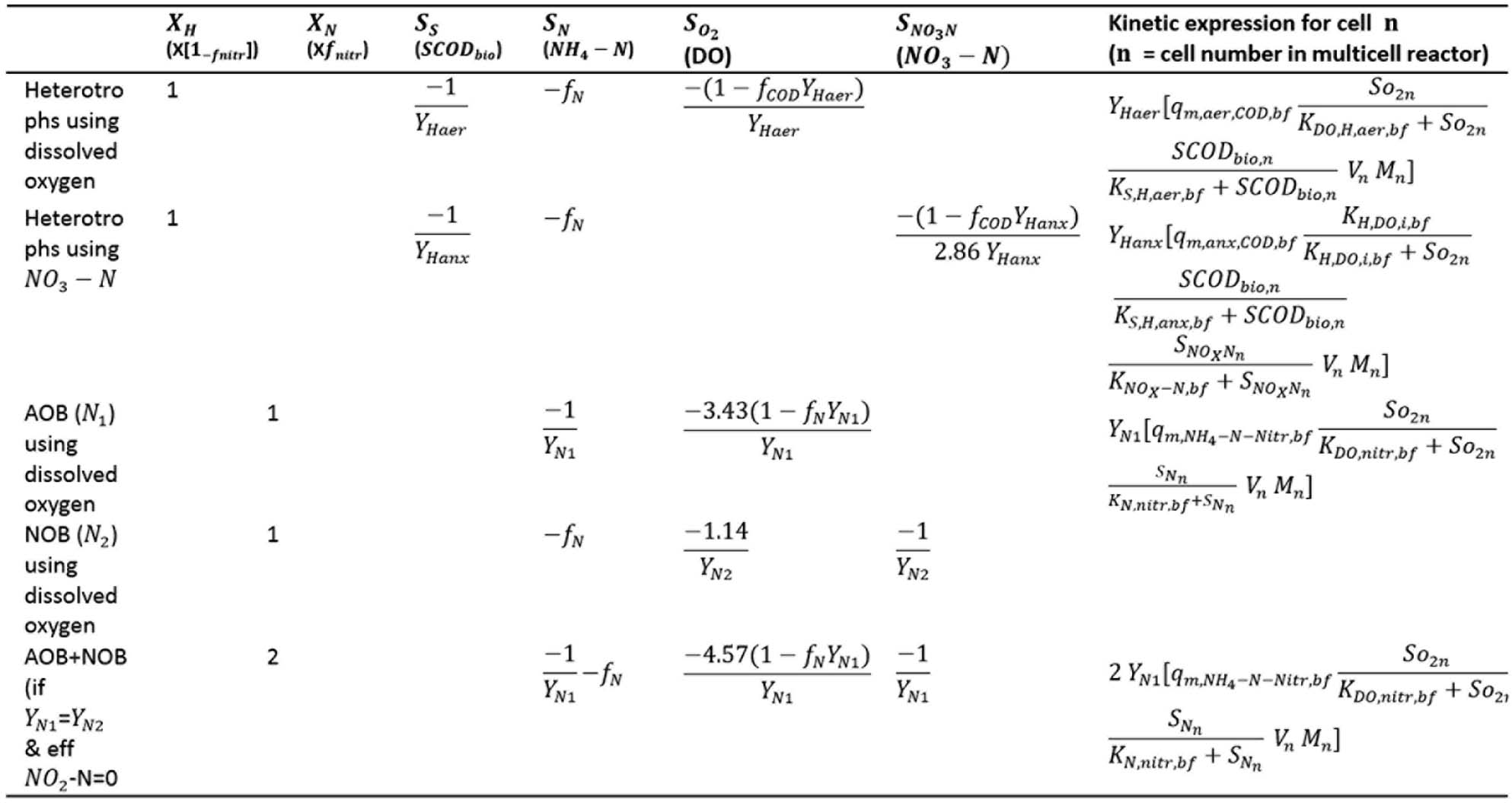 Table 3. Matrix showing kinetic coefficients for MLVSS in semi-empirical and biofilm models (Sen and Randall, 2008a)
