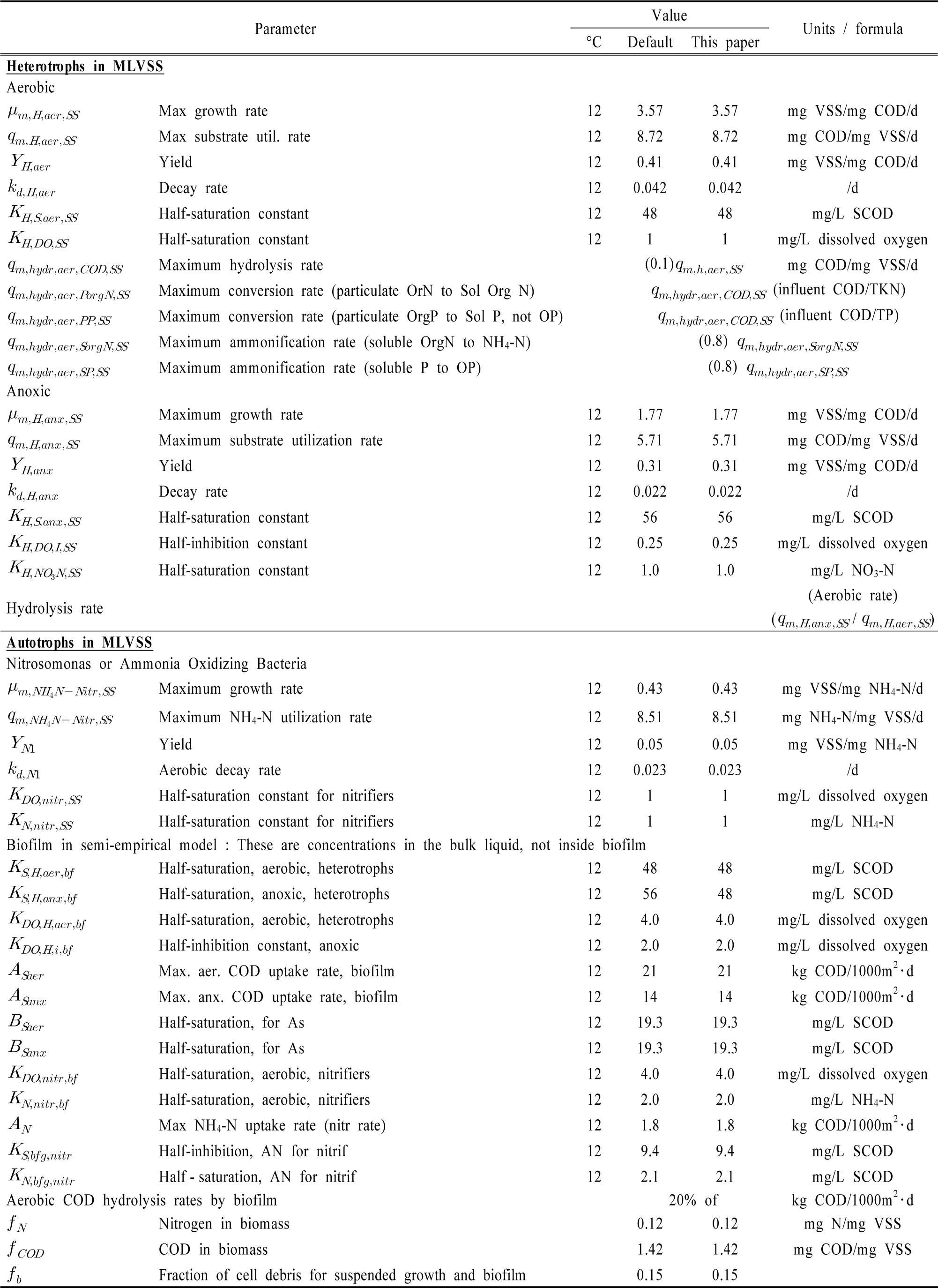 본 연구에서 적용한 준 경험모델의 독립 및 종속영향 미 생물의 동력학(Kinetic) 상수들은 Sen and Randall (2008a)이 제시하고 있는 준 경험모델(semi-empirical model)의 기본값을 적용하였다. Table 34는 BAF 반응조내에서의 MLVSS 및 바이오필름에 대한 준 경험 모델에 대한 프로세스를 매 트릭스 형태로 나타내고 있다(Sen and Randall, 2008a). 매 트릭스의 행은 입자성 물질과 용존물질에 대한 상태변수를 나타내고 있으며, 마지막 행에는 kinetic 식을 표현하고 있 다. 또한, 열에는 kinetic 식에 곱해지는 계수 값들이 표현 되어 있다. 공정 모델링을 위하여 매트릭스 형태로 상태변 수와 반응식을 표현하는 방법은 IWA ASMs 등에서 널리 사용하고 있으며, 본 연구에서도 제시한 매트릭스를 이용하여 컴퓨터 시뮬레이션을 수행하였다. 준 경험 모델과 ASMs 모델과의 차이점 중의 하나는 ASMs 모델의 경우 부유성장 미생물과 기질에 대해서만 모델에서 정의하고 있는 반면, 준경험모델에서는 바이오 필름에 대한 모델을 추가로 정의 하고 있다.