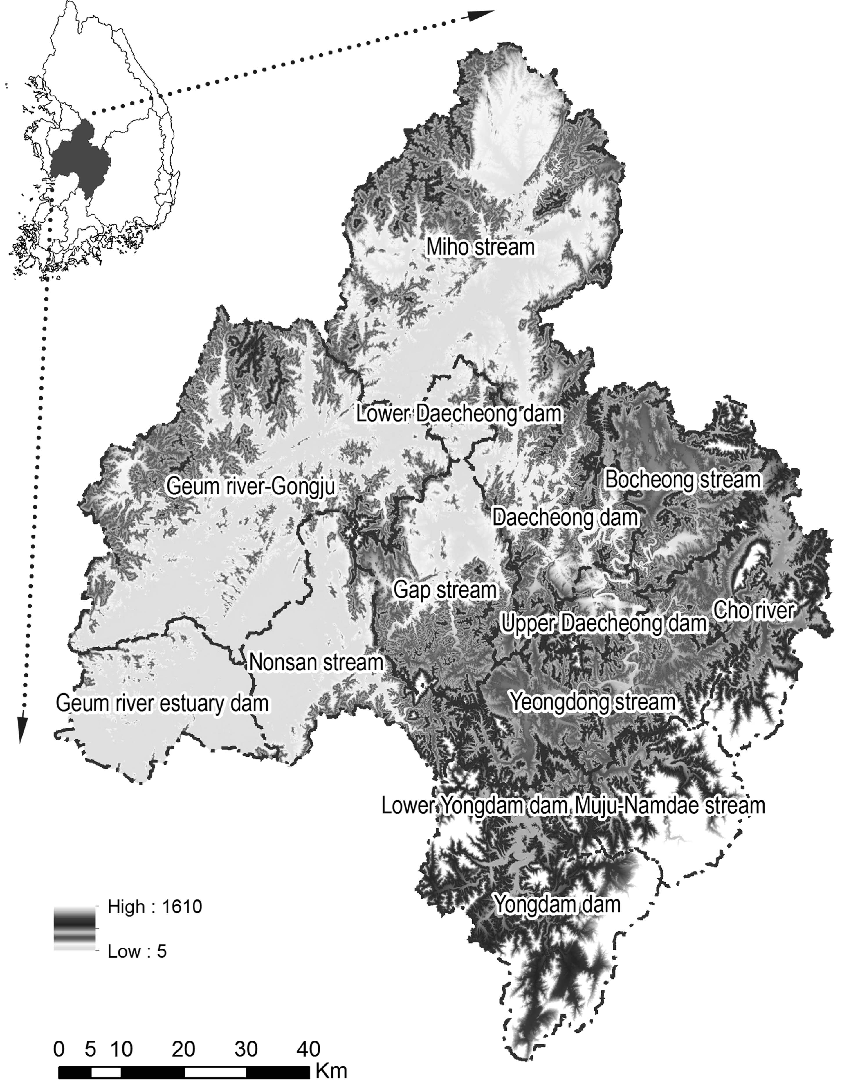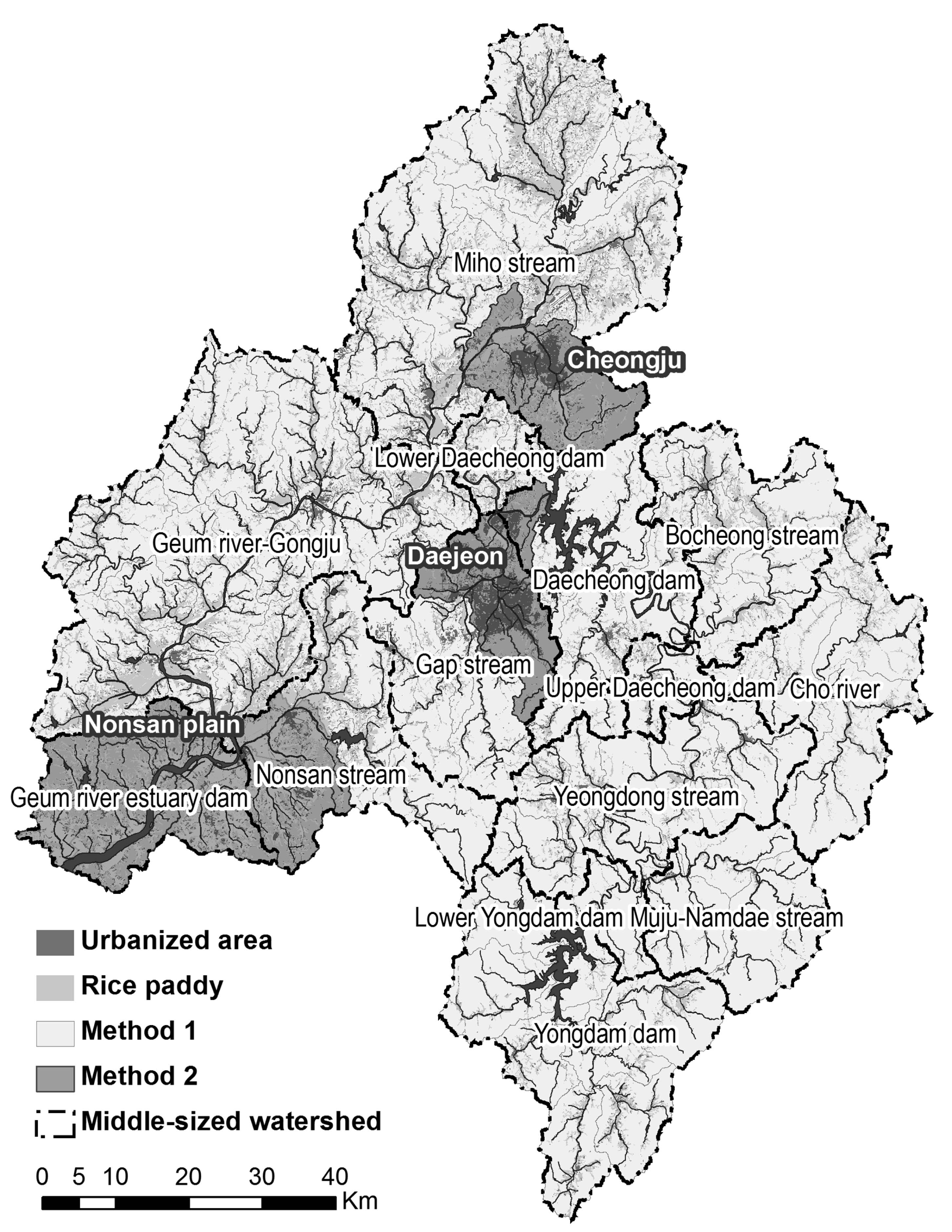 금강유역은 14개의 중권역으로 구성되며 그 특징을 살펴 보면 다음과 같다(Fig. 1). 금강 상류의 용담댐, 용담댐하류, 무주남대천, 영동천, 초강 유역은 주로 산림지역으로 산림 면적이 70% 이상을 차지한다. 금강 중류 지역은