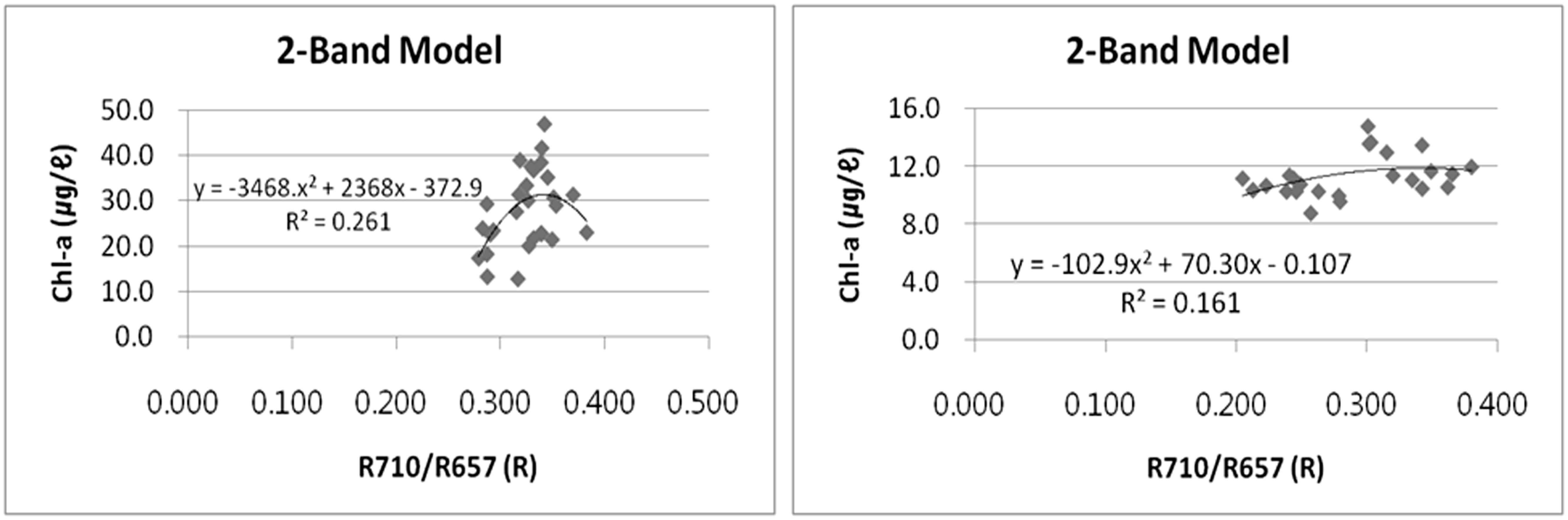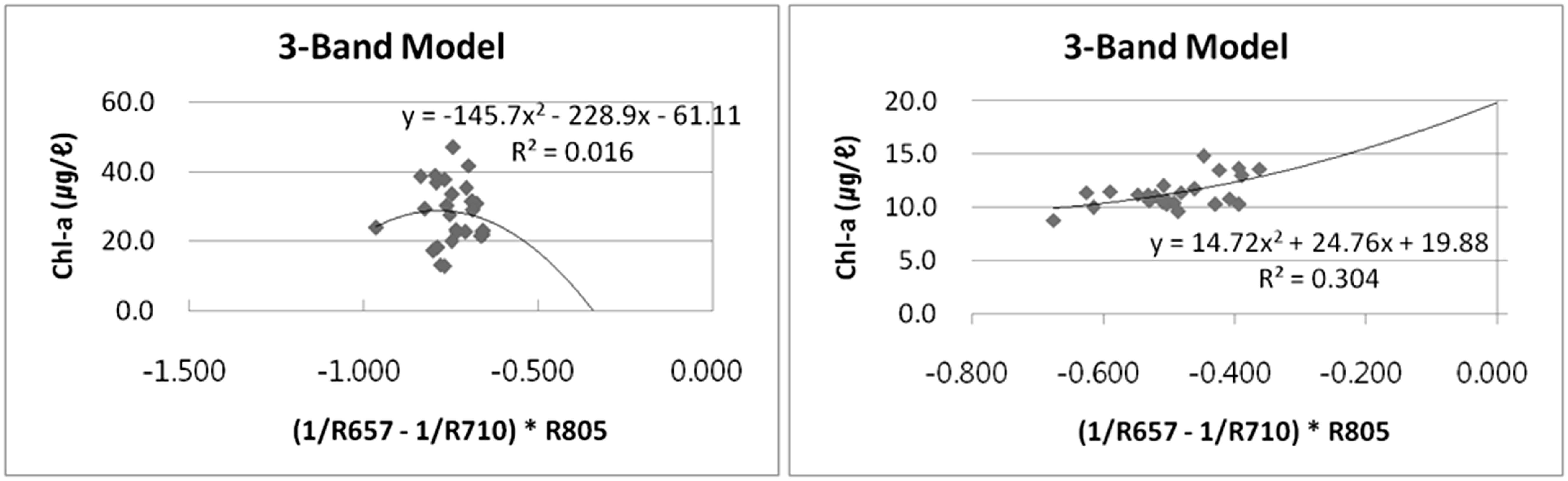 Fig. 10. Relationship between observed Chl-a concentrations and R values calculated by imageries acquired on 14, October (left) and 12, November (right) with Red-RE-NIR three-band Chl-a estimation equations