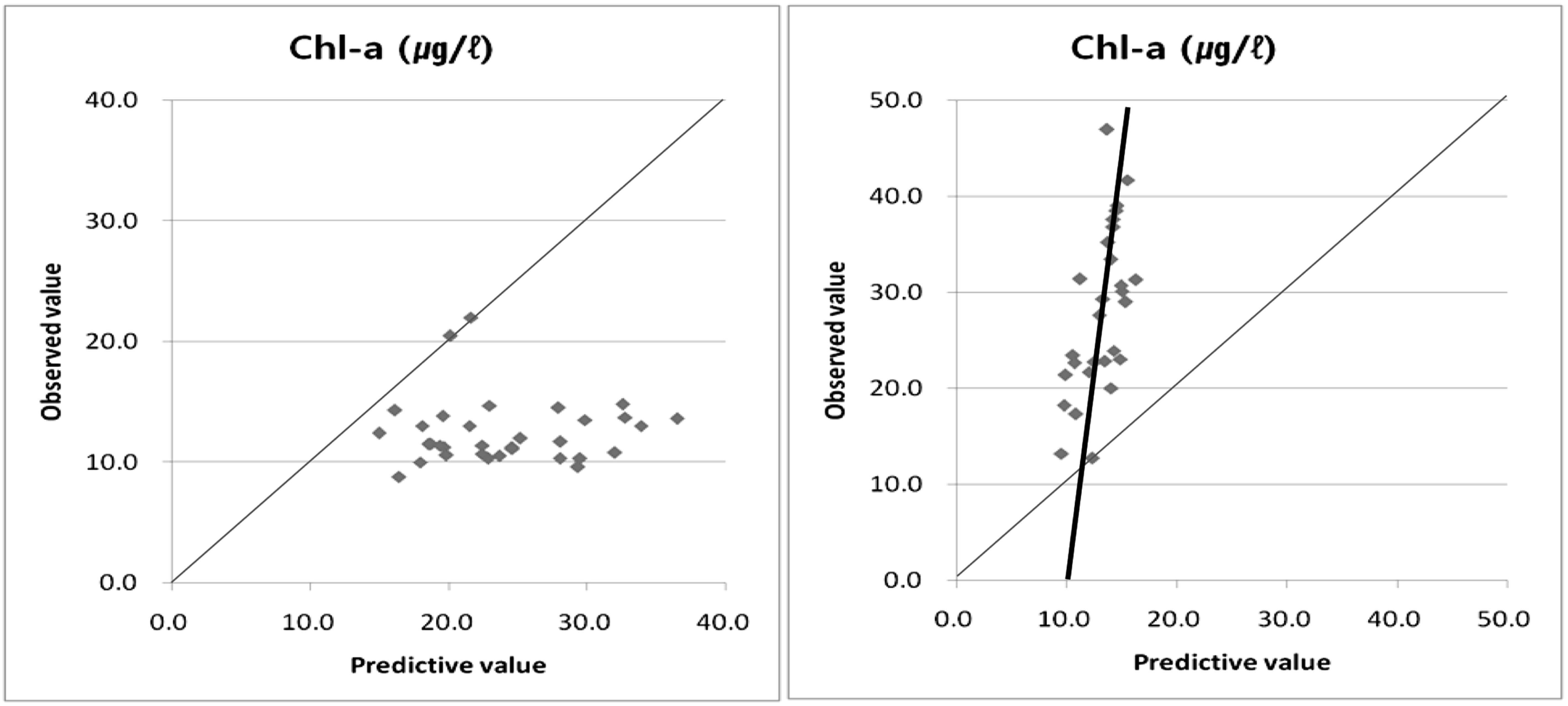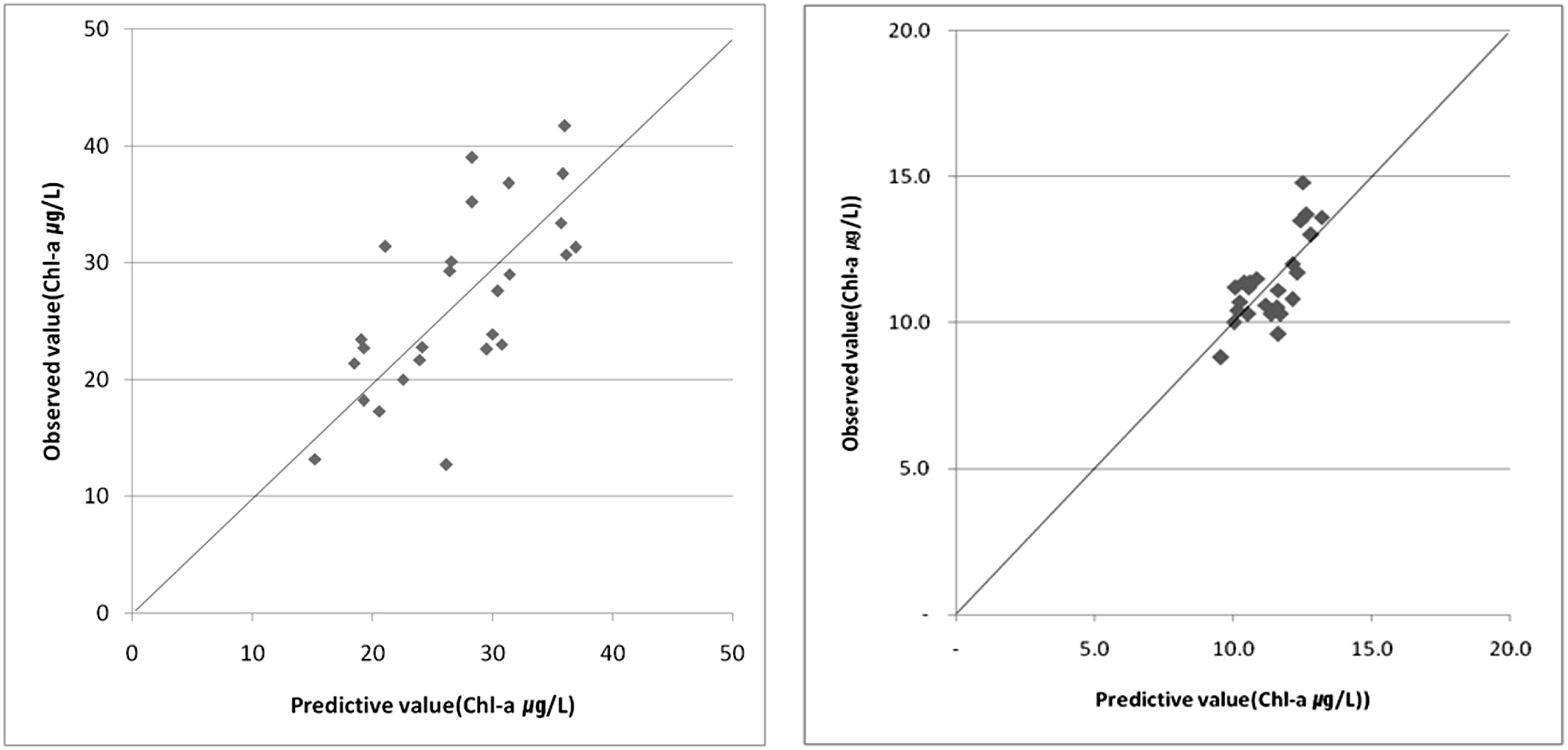 Fig. 6. Relationship between observed and calculated Chl-a concentrations, 14 Oct. (left), 12 Nov. (right), 2013.