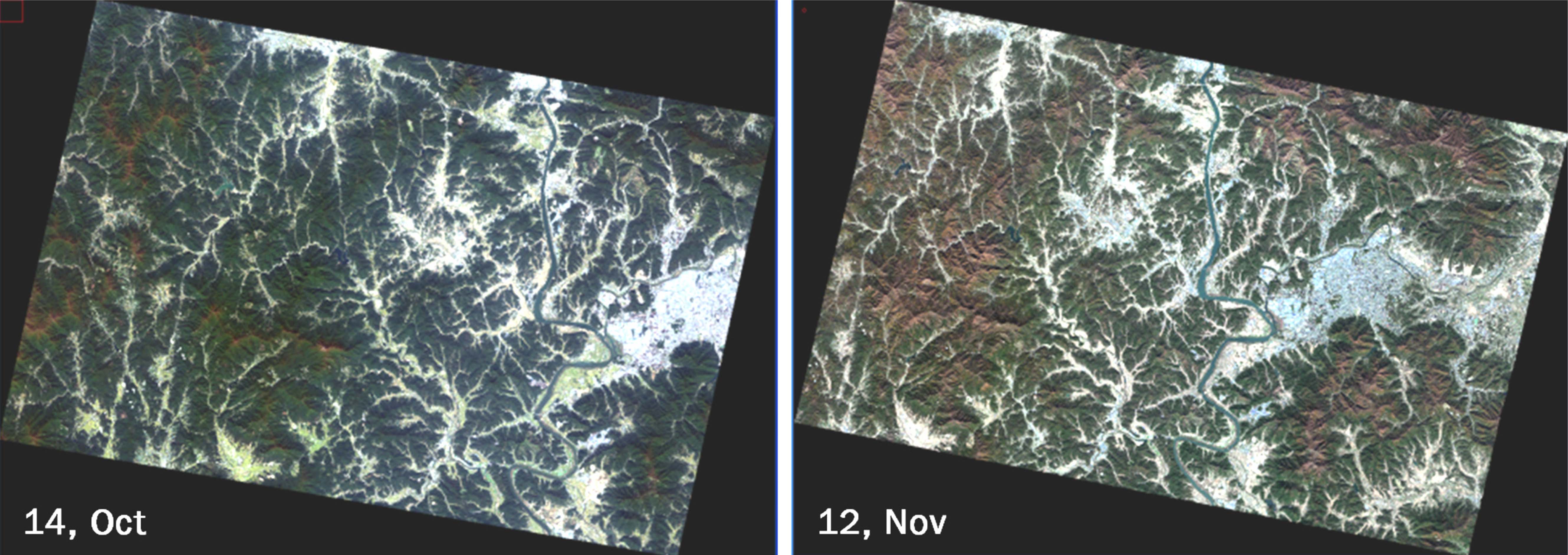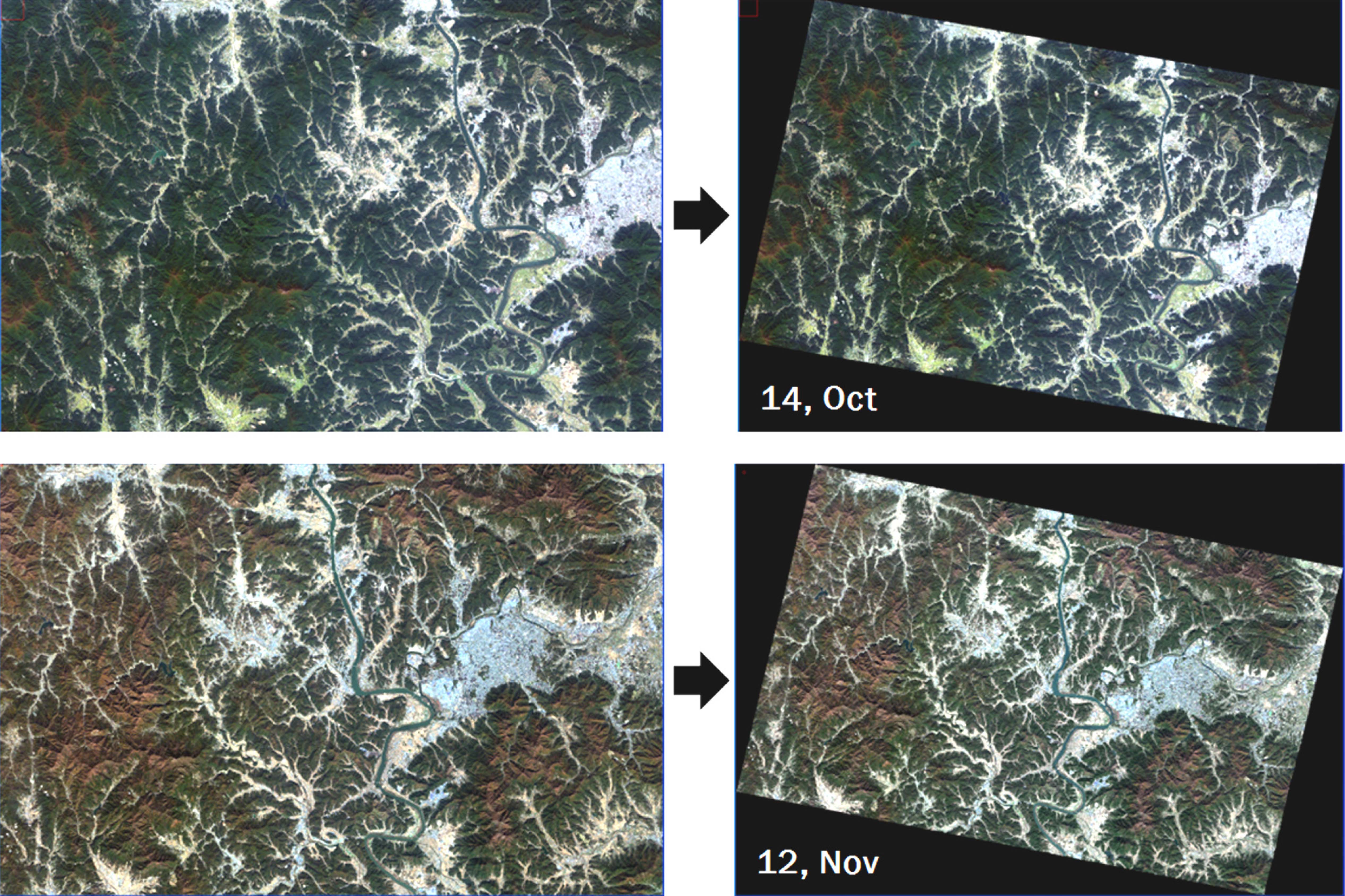 summer, 11월 영상은 fall and spring으로 적용하였다. 입력된 조건을 기준으로 10월 과 11월 영상의 대기보정을 수행하였다(Fig.