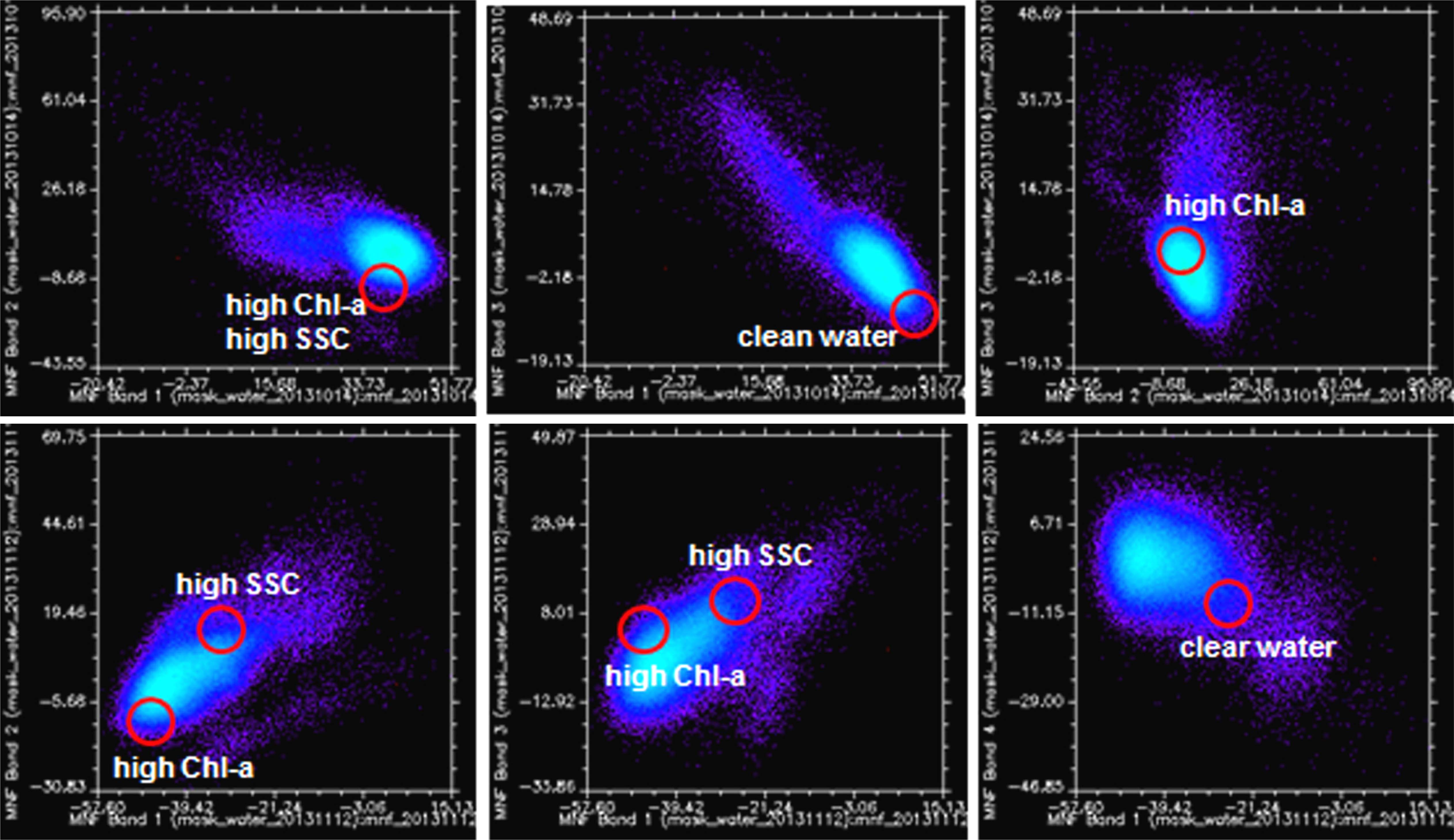 찾아내고 선형분광혼합분석을 적용 하여 다중회귀분석한 결과, 부유물질과 클로로필의 농도 분포 와 상관없이 클로로필a의 농도 추정이 가능하다고 하였다.