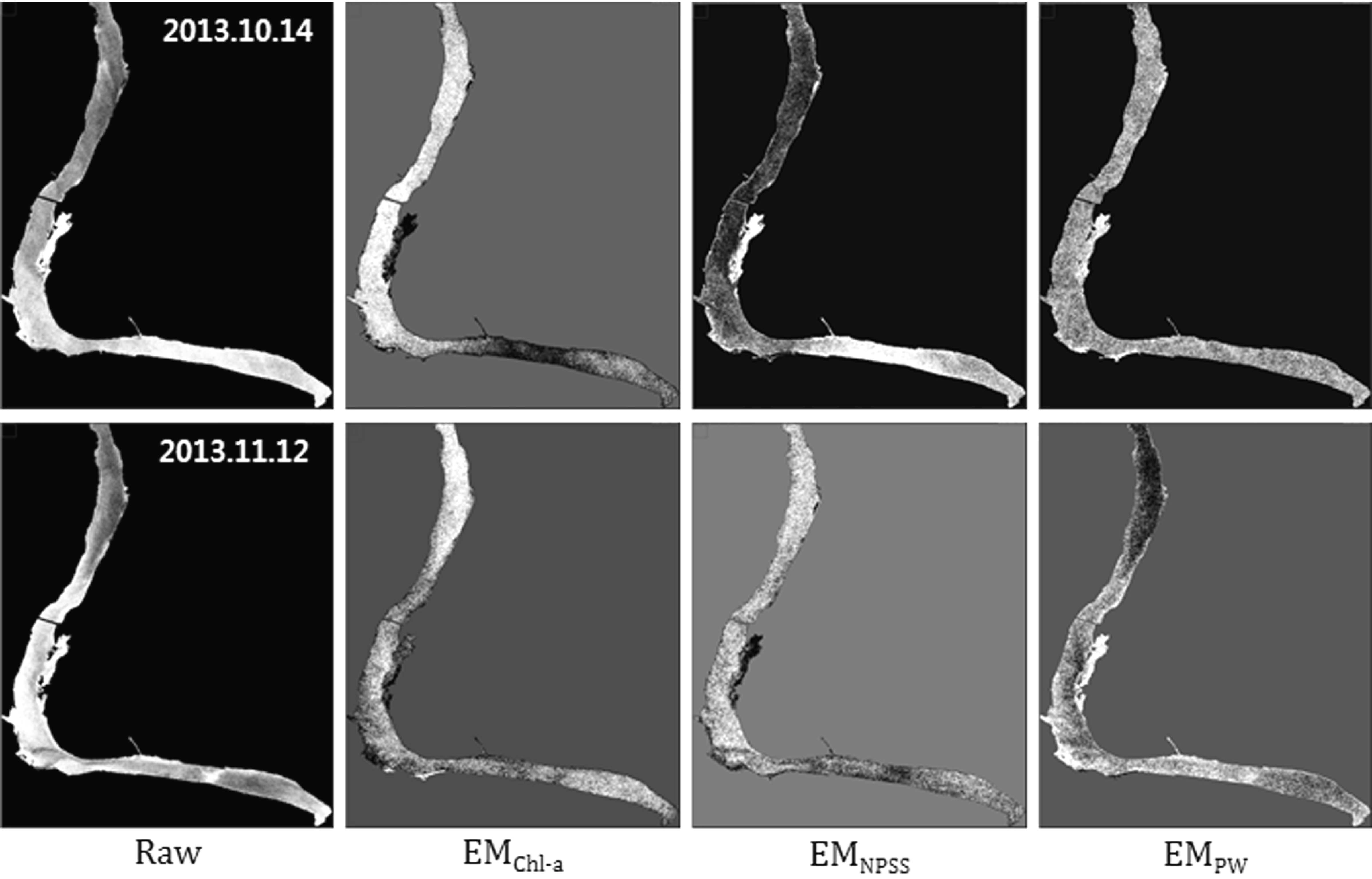 10월과 11월 현장조사 결과에서 보듯이 클로로필a 농도가 매우 낮아 영상 내에서 클로로필a에 대응하는 단일 분광요소를 선택하기 힘들었던 점도 분석의