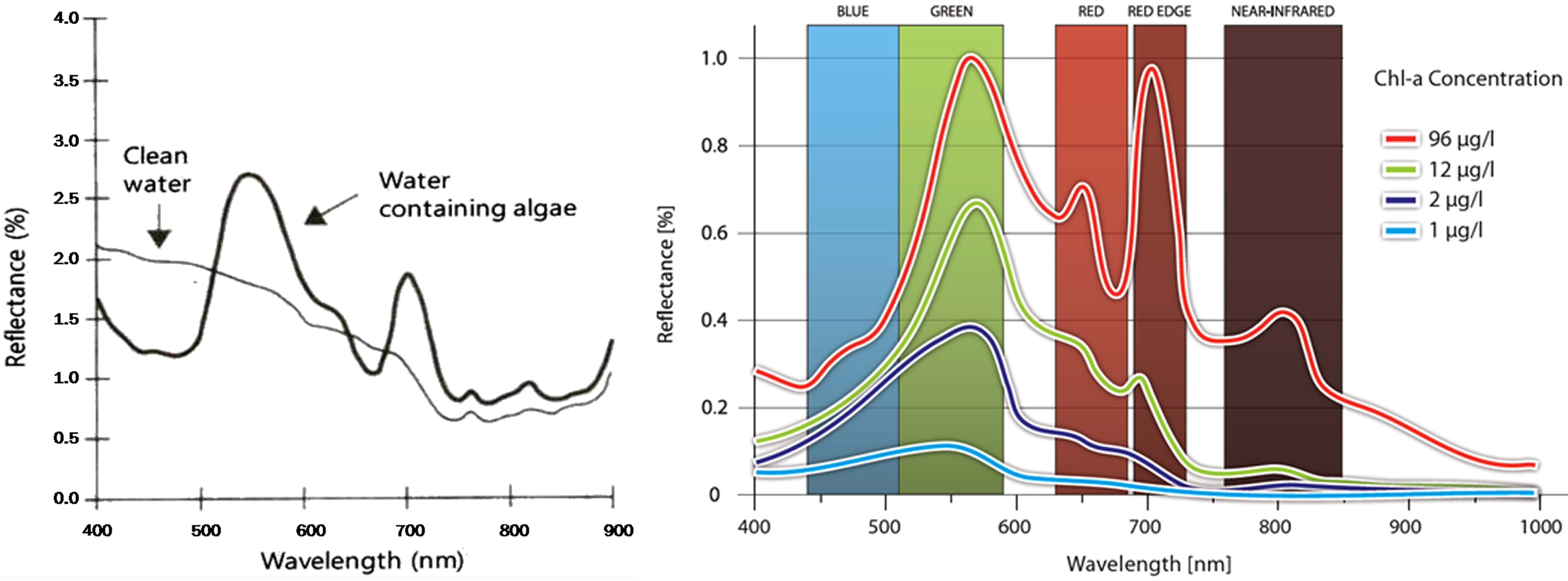 Fig. 7. Comparison of spectrum between water containing algae and clean water (left,Jenson, 2006) and Chlorophyll-a reflectance for different concentration in water in the visible and NIR spectrum (right, RapidEye inc.).