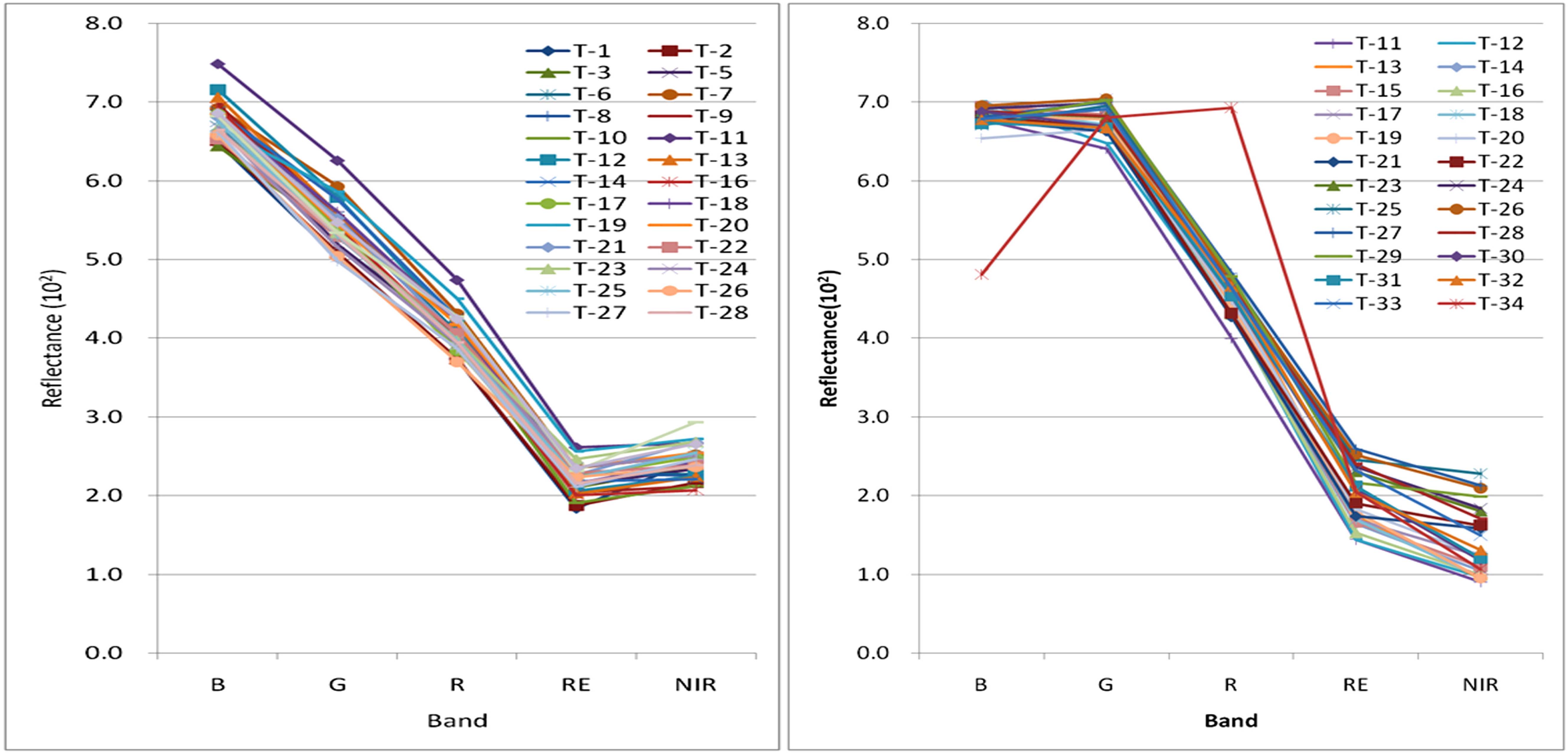 Fig. 8. Reflectance (×100) variation of RapidEye image pixel for the sampling points; Imagery acquired on 14, October (left) and 12, November (right).