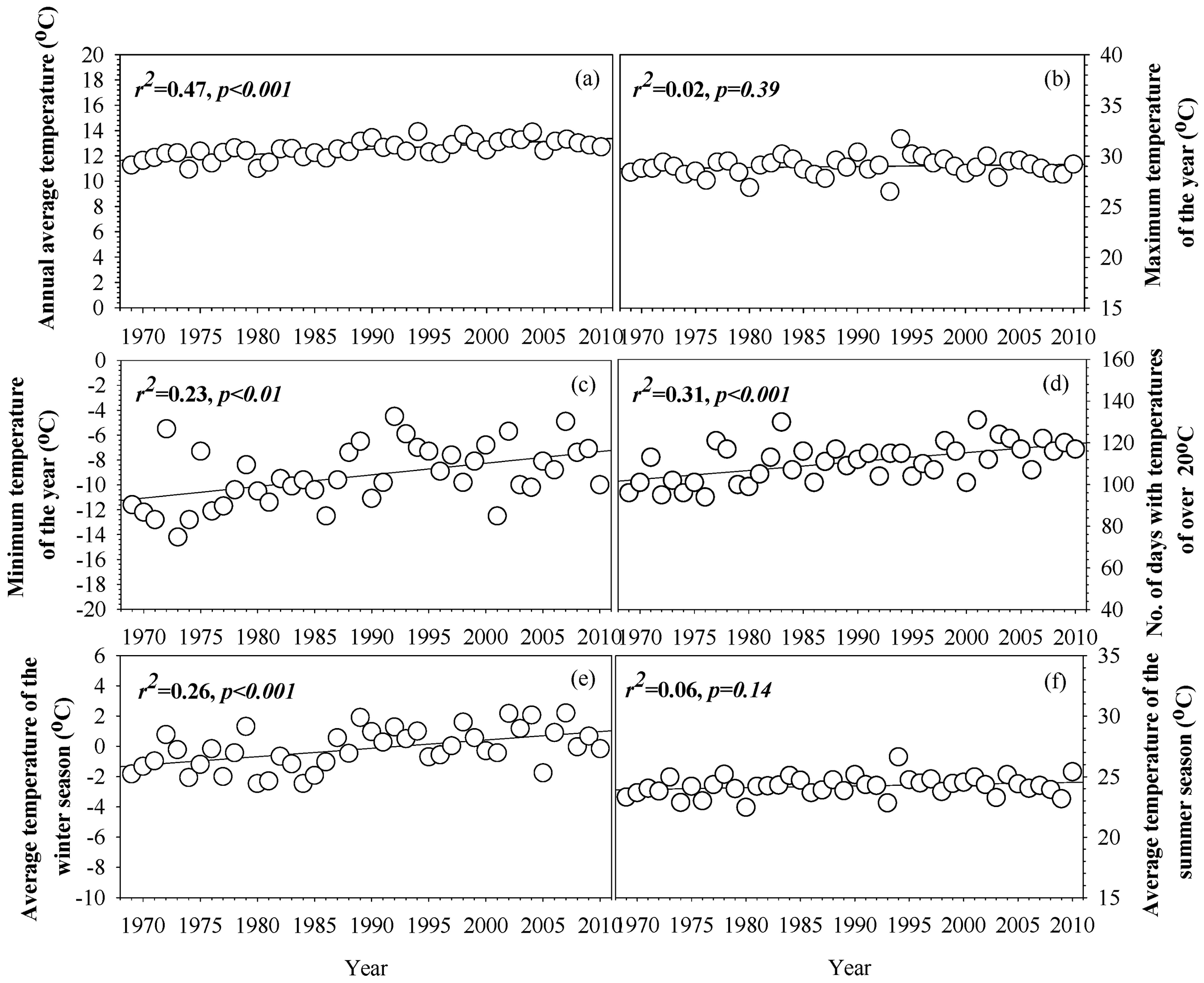 Figure 2. Change of Annual average temperature (a), Maximum temperature of the year (b), Minimum temperature of the year (c), Number of days with temperatures of over 20°C (d), Average temperature of the winter season (e) and Average temperature of the summer season (f) from 1969 to 2010 in Daechung reservoir.