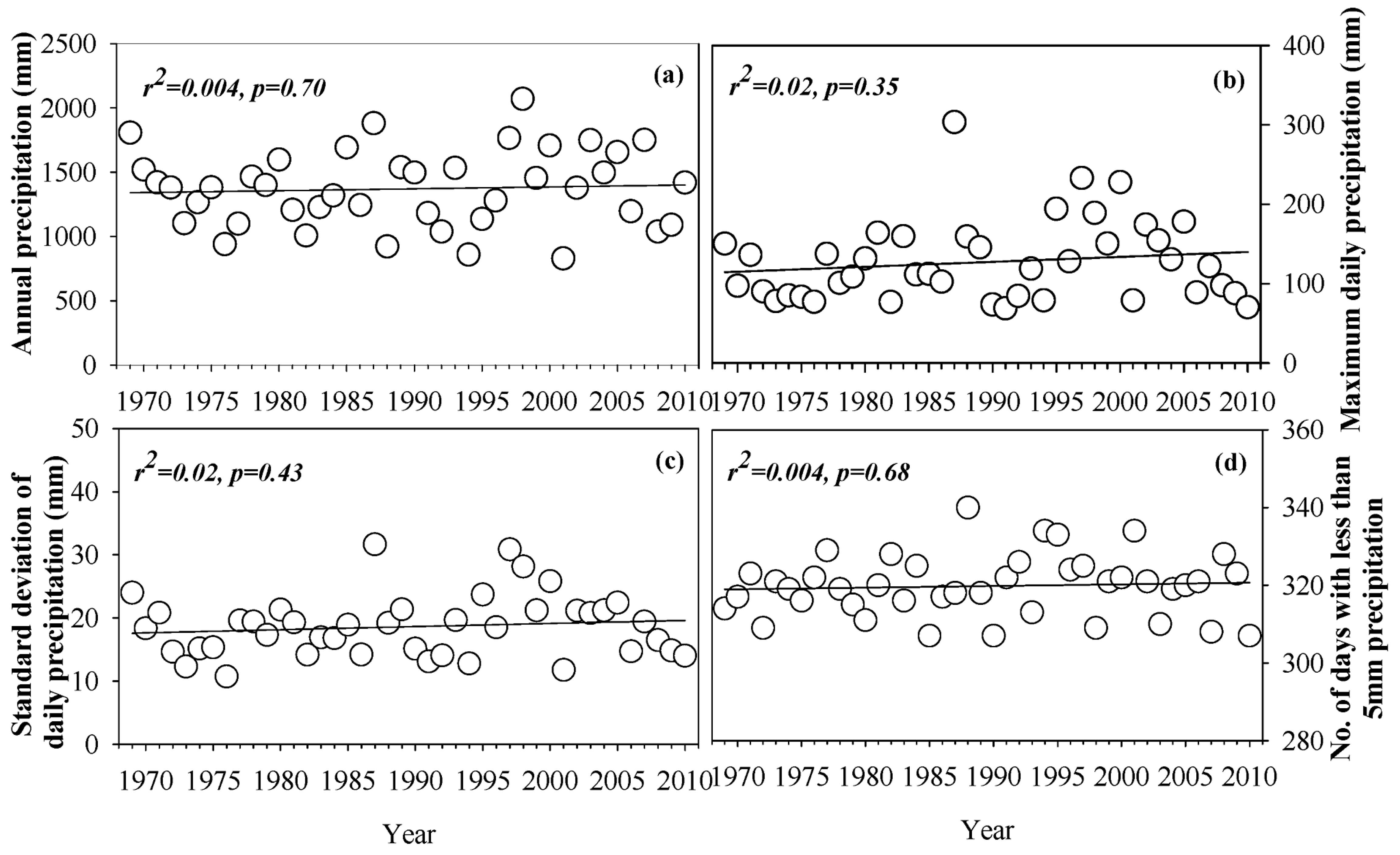 Figure 3. Change of Annual precipitation (a), Maximum daily precipitation (b), Standard deviation of daily precipitation (c), Number of days with less than 5 mm precipitation (d) from 1969 to 2010 in Daechung reservoir.