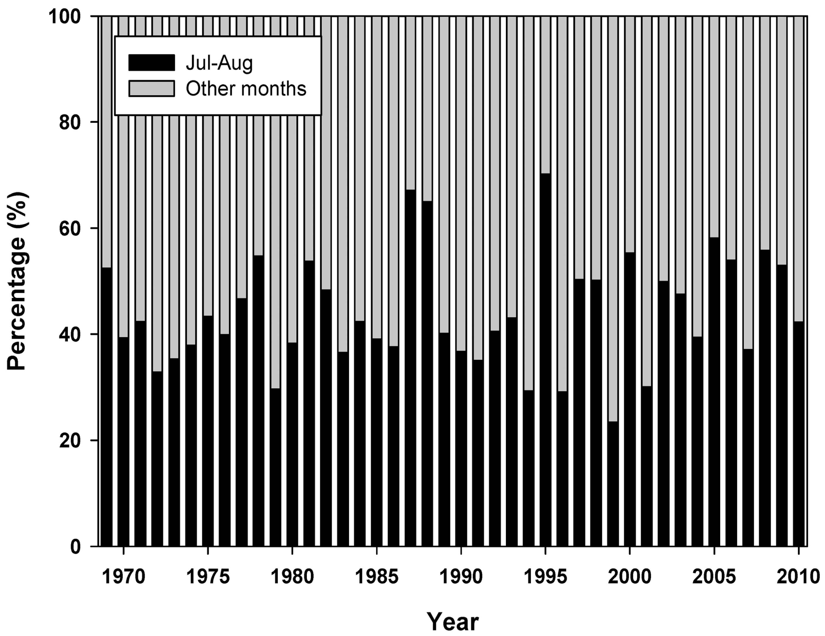 1969년부터 2010년까지 대청호 유역의 연 강우량은 828.7 mm로 2001년에 최저 강우량을, 2070.0 mm로 1998년 최고 강우량을 보여주었다. 5 mm 미만 강우일수는 307 ~ 340의 범위로 큰 차이를 보이지 않았으며 1998년 최대값을 보였 다(Fig. 3). 대청호 유역에서 7월~ 8월 장마기간 동안 강우 량은 1987년 1,261.9 mm (67.1%)로 최고 집중강우기를 보 였으며 대부분 40% 이상의 높은 강우량을 나타내어 우리 나라의 몬순 기후 특성을 보여주었다(An et al., 2001)(Fig. 4). Seasonal Mann-Kendall법을 이용한 시계열 추이 분석 결과 대청호 유역의 연강우량, 연중 일최대강우량, 연간일 강우량편차 및 5 mm 미만 강우일수 등은 모두 유의한 증 감패턴을 보이지 않아 대청호 유역의 강우량 변화는 기후 변화에 따른 특정한 양상을 보이지 않는 것으로 나타났다.