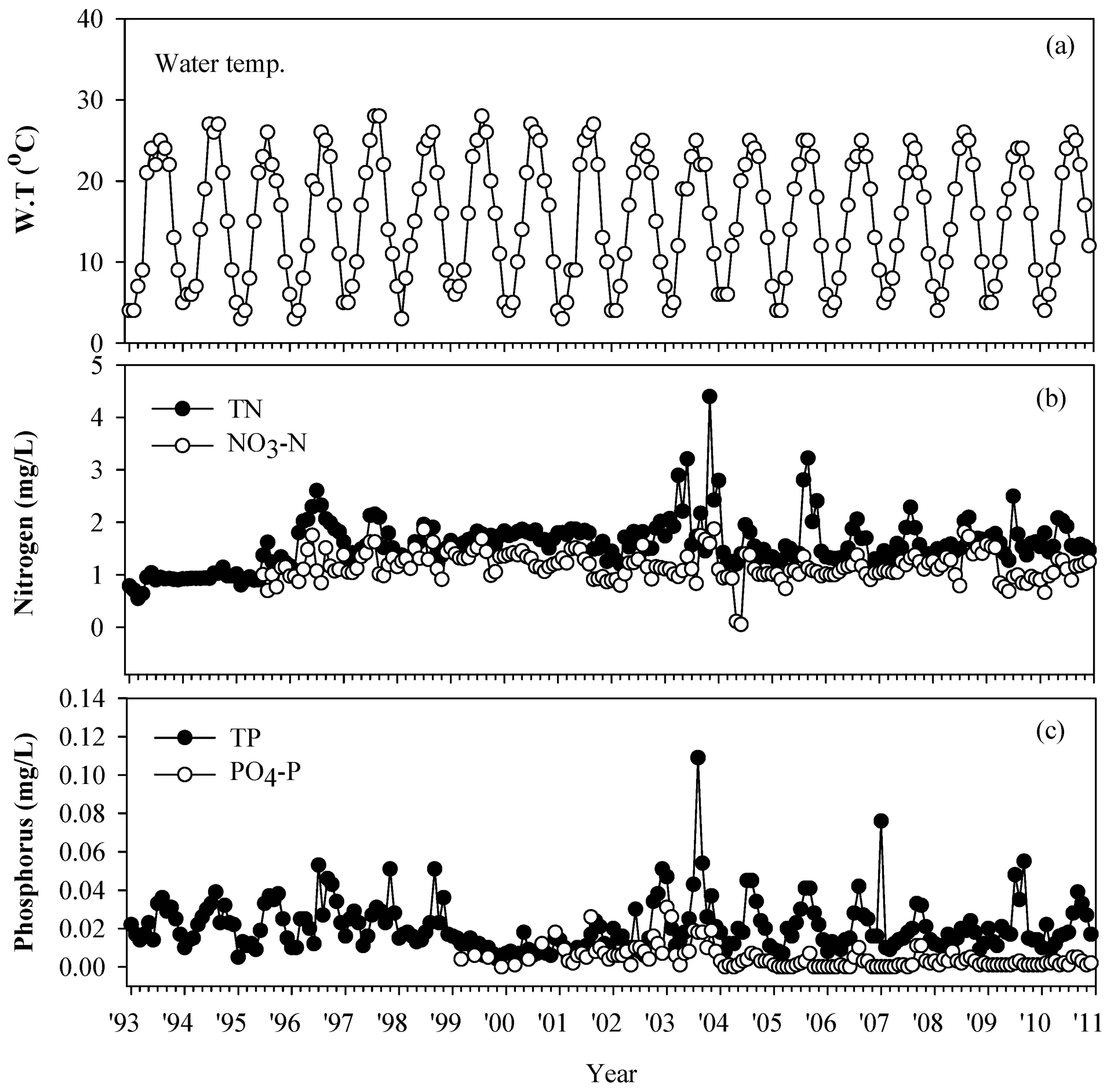 Figure 5. Change of Water temperature (a), Nitrogen concentration (b), Phosphorus concentration (c) from 1993 to 2010 in Chudong station of the Daechung reservoir.