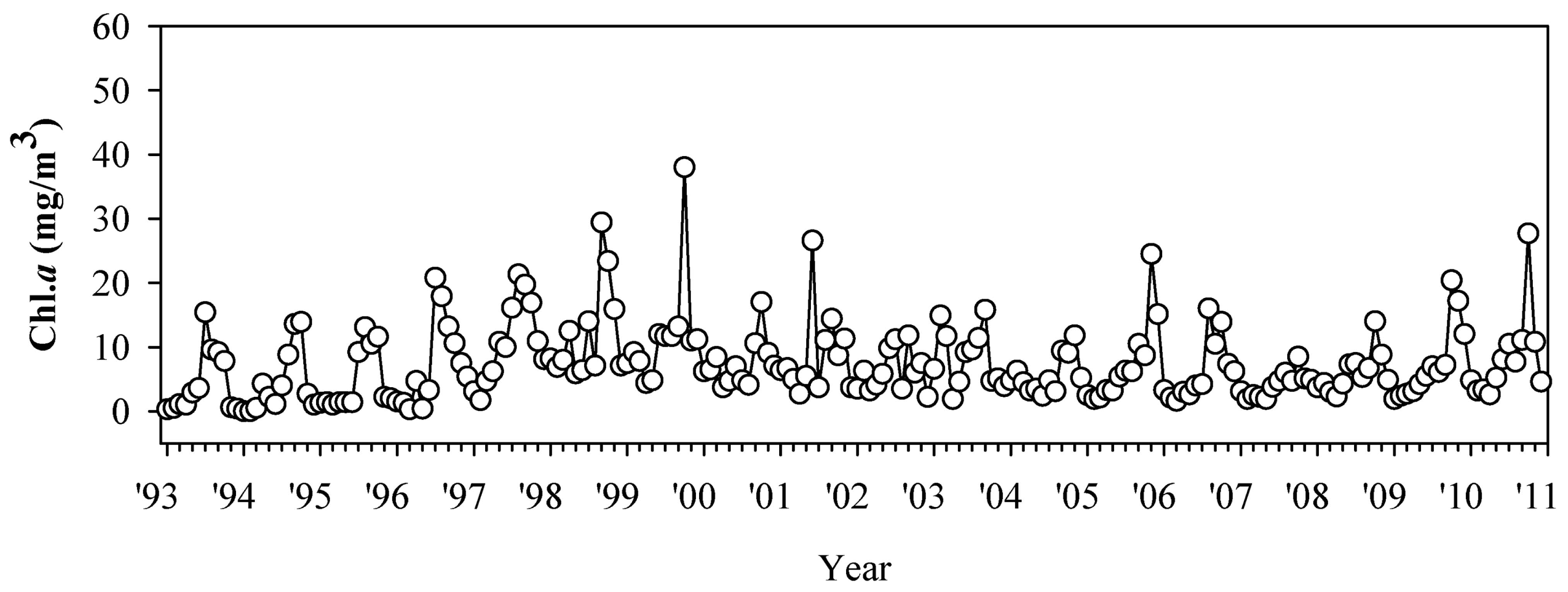 Figure 6. Change of Chlorophyllafrom 1993 to 2010 in Chudong station of the Daechung reservoir.
