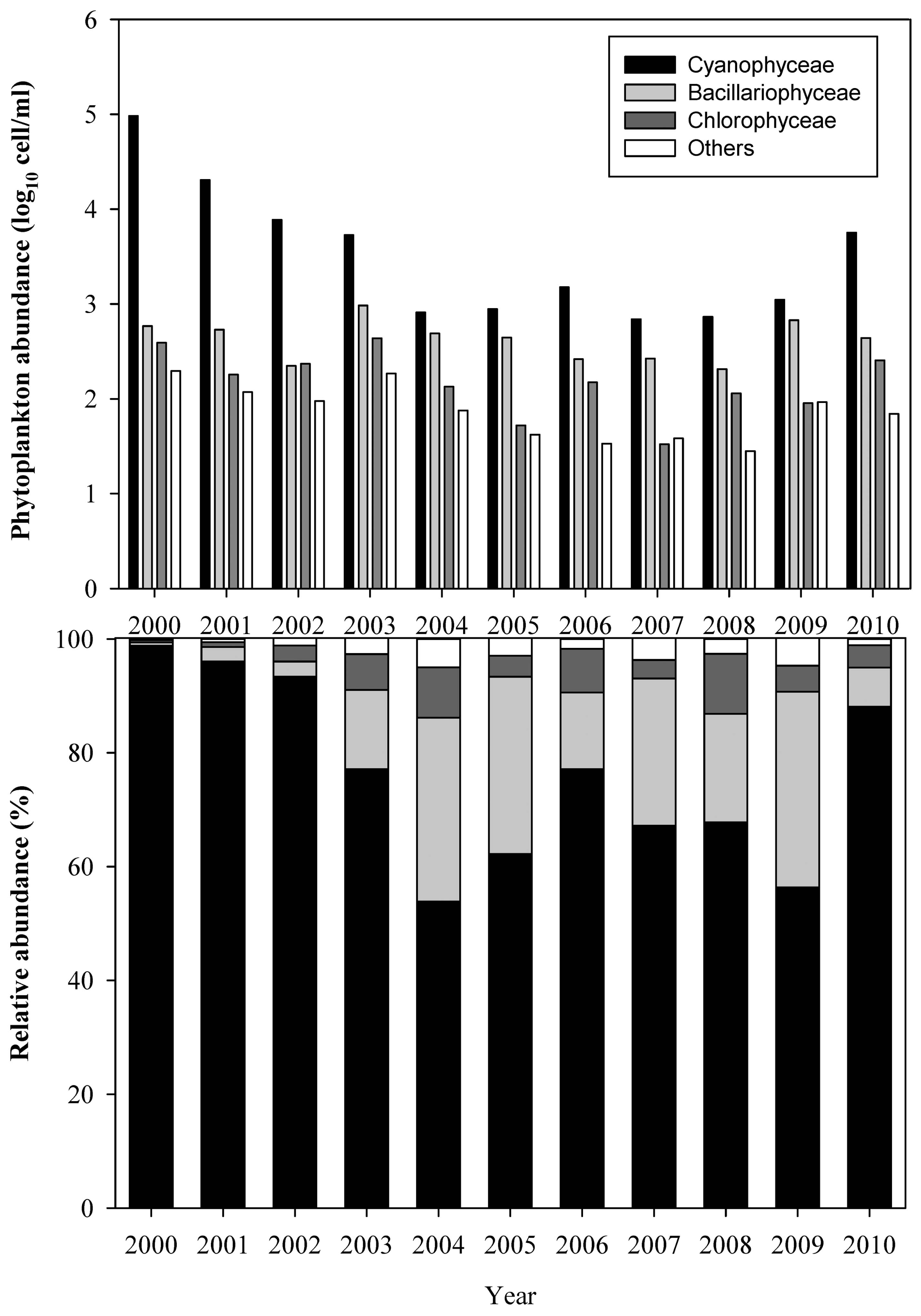 Figure 7. Variation of phytoplankton community (top) and percentage of relative abundance (bottom) from 2000 to 2010 in Chudong station of the Daechung reservoir.