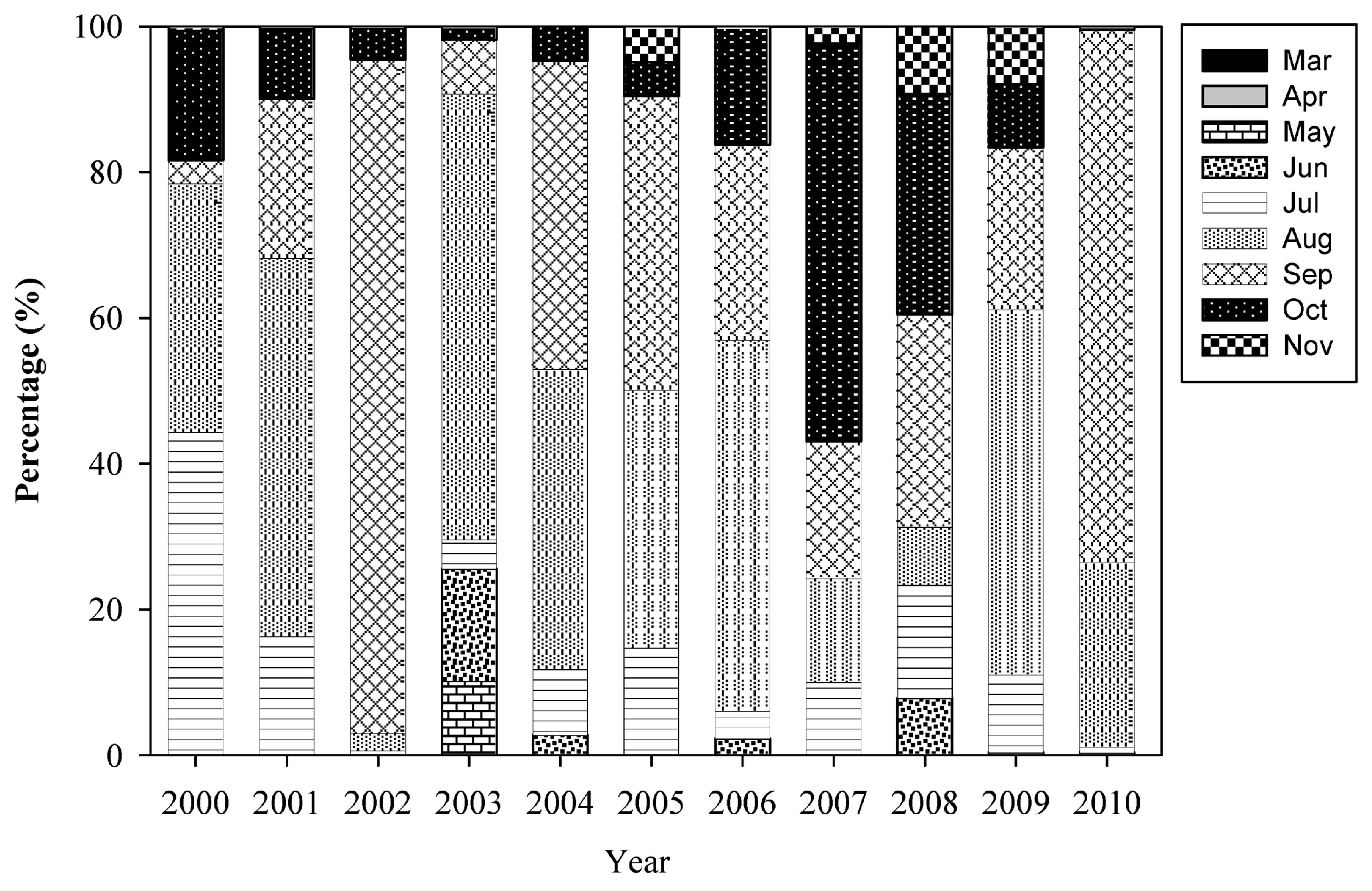 Figure 8. Percentage of monthly cyanobacteria abundance from 2000 to 2010 in Chudong station of the Daechung reservoir.