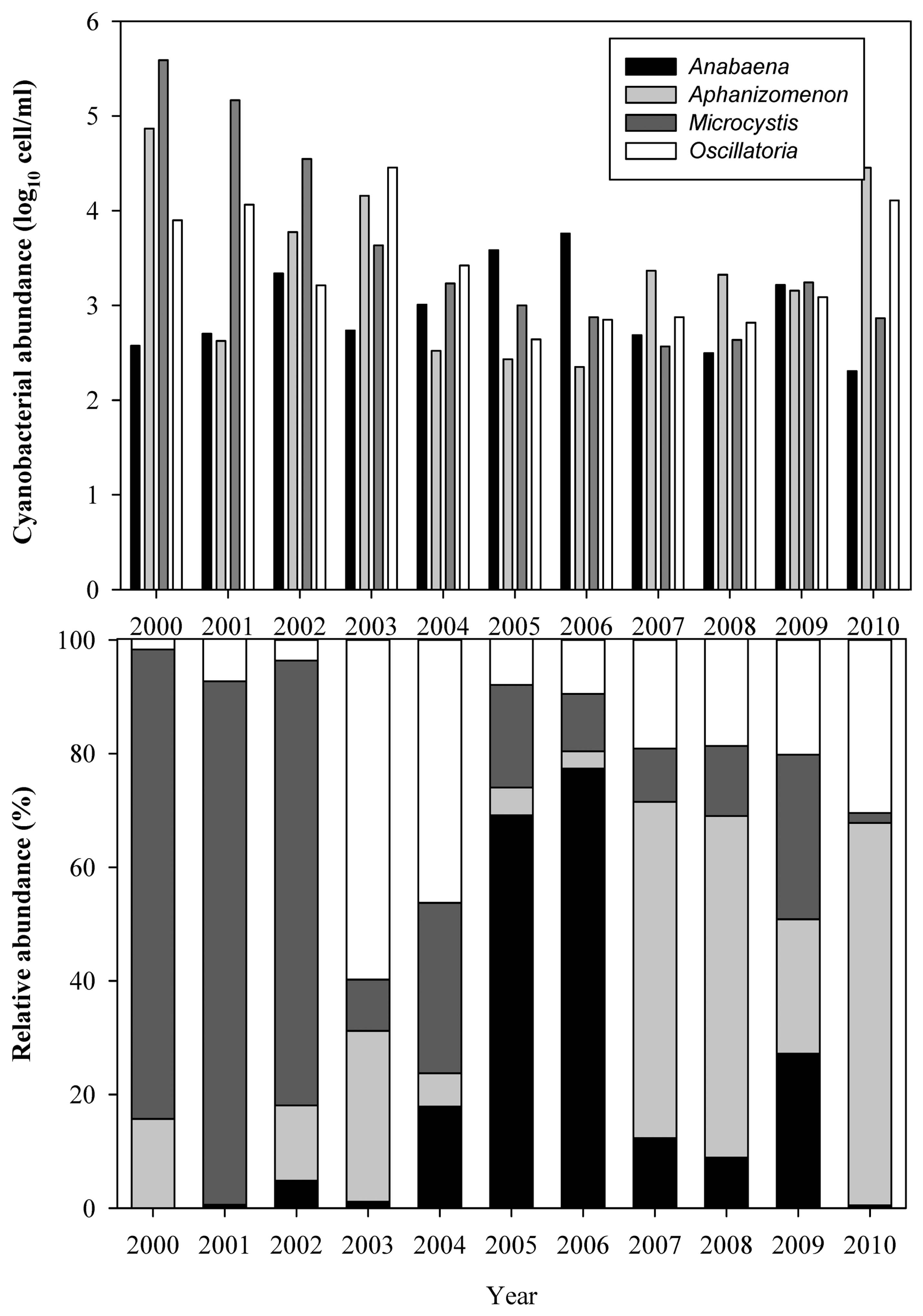 Figure 9. Variation of cyanobacteria genus (top) and percentage of relative abundance (bottom) from 2000 to 2010 in Chudong station of the Daechung reservoir.