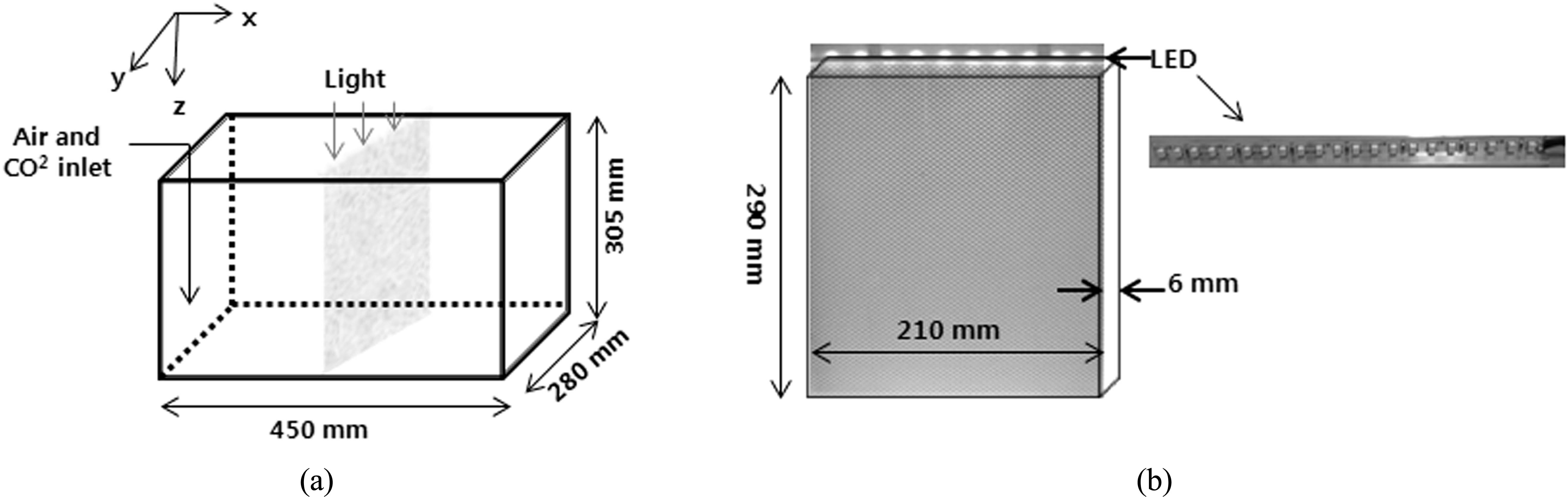 로 인해 광합성의 저해현상이 발생되었기 때문이다(Moreno-Garrido, 2008; Wu and Shi, 2007). 이러한 그림자효과로 인한 광합성 저해효과를 극복하기 위하여 반응기에 도광판 (optical panel)을 삽입하고 광원으로 LED(Light