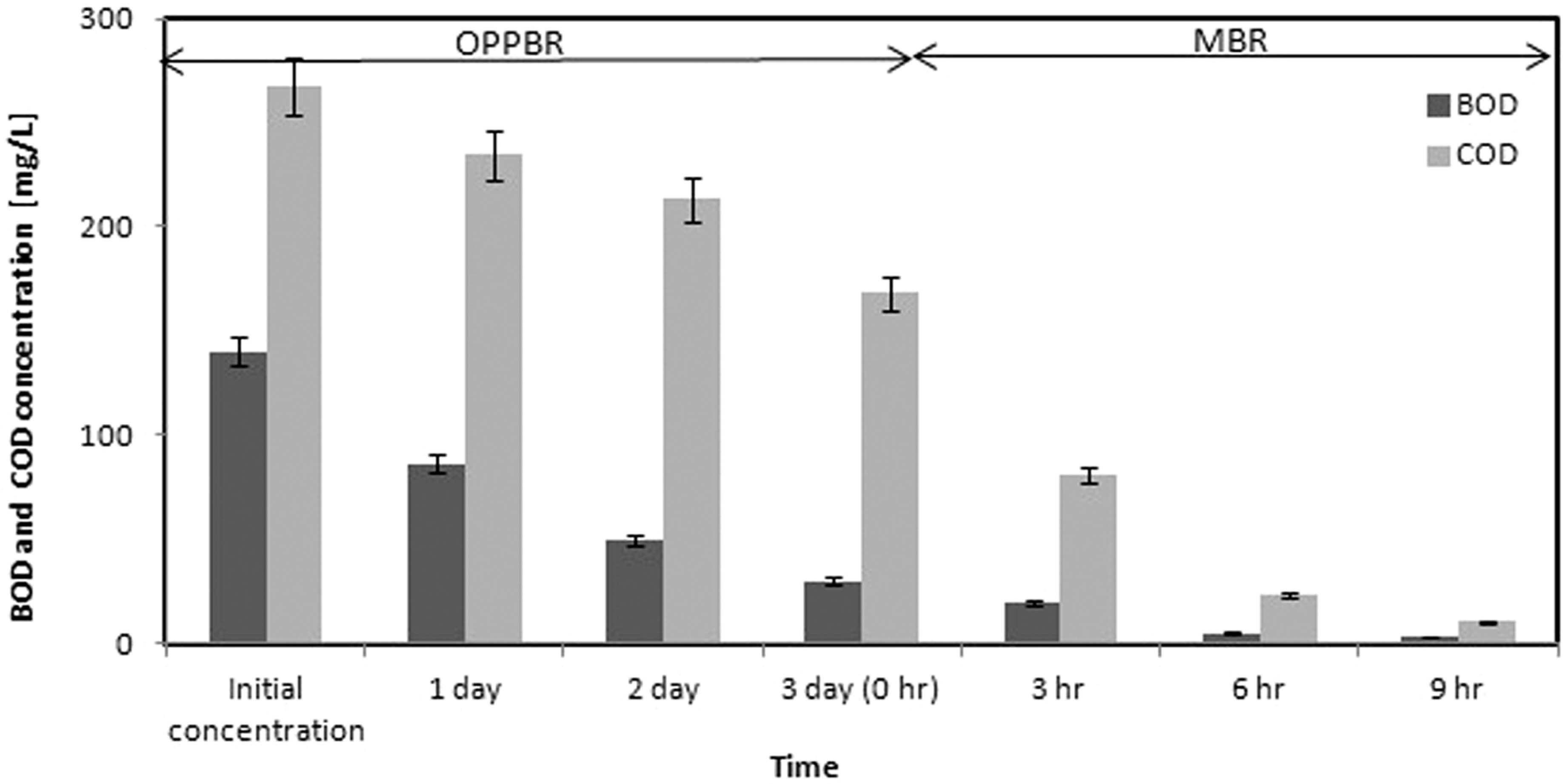 BOD와 COD는 OPPBR 공정에서 각각 78.45%와 37.12%, MBR에서 19.11%와 58.94%의 제거효율을 나타내어, MMBR공정에서는