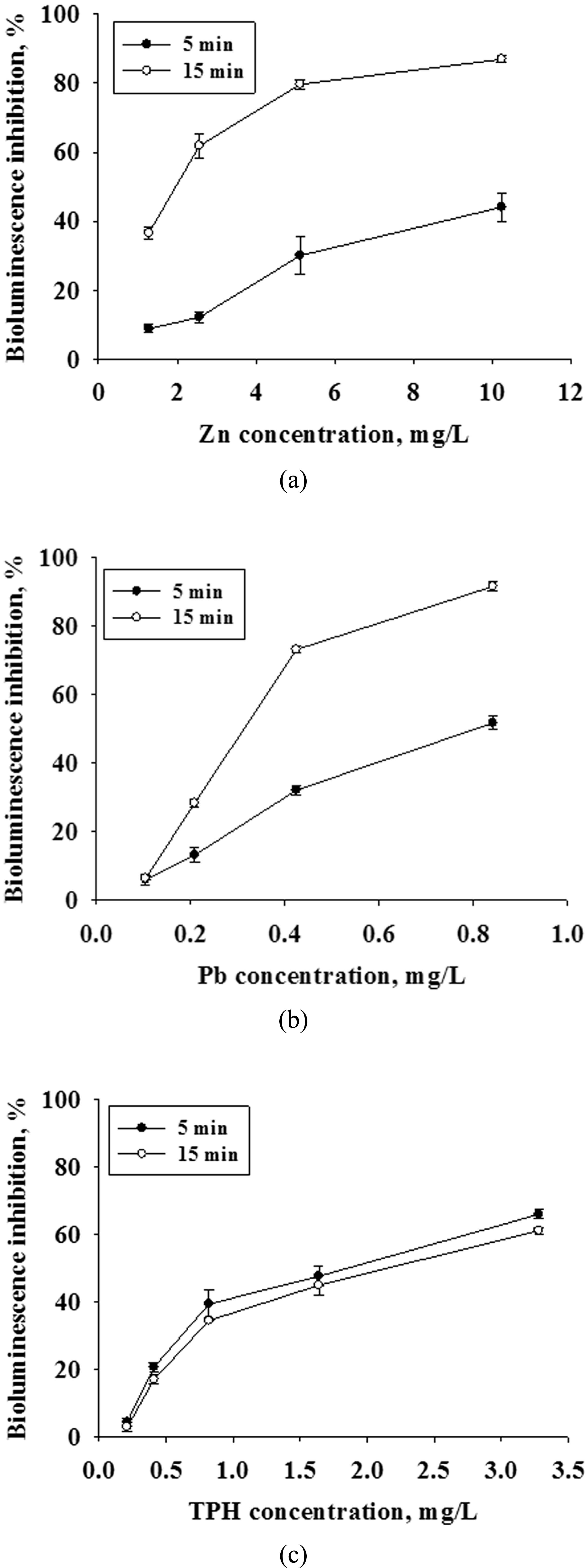 Figure 1. Dose-response curves for bioluminescence inhibition ofVibrio fischeriafter 5 min and 15 min exposure to a dilution series of Zn (a), Pb (b), and TPH (c). Error bars indicate the 95% confidence intervals.