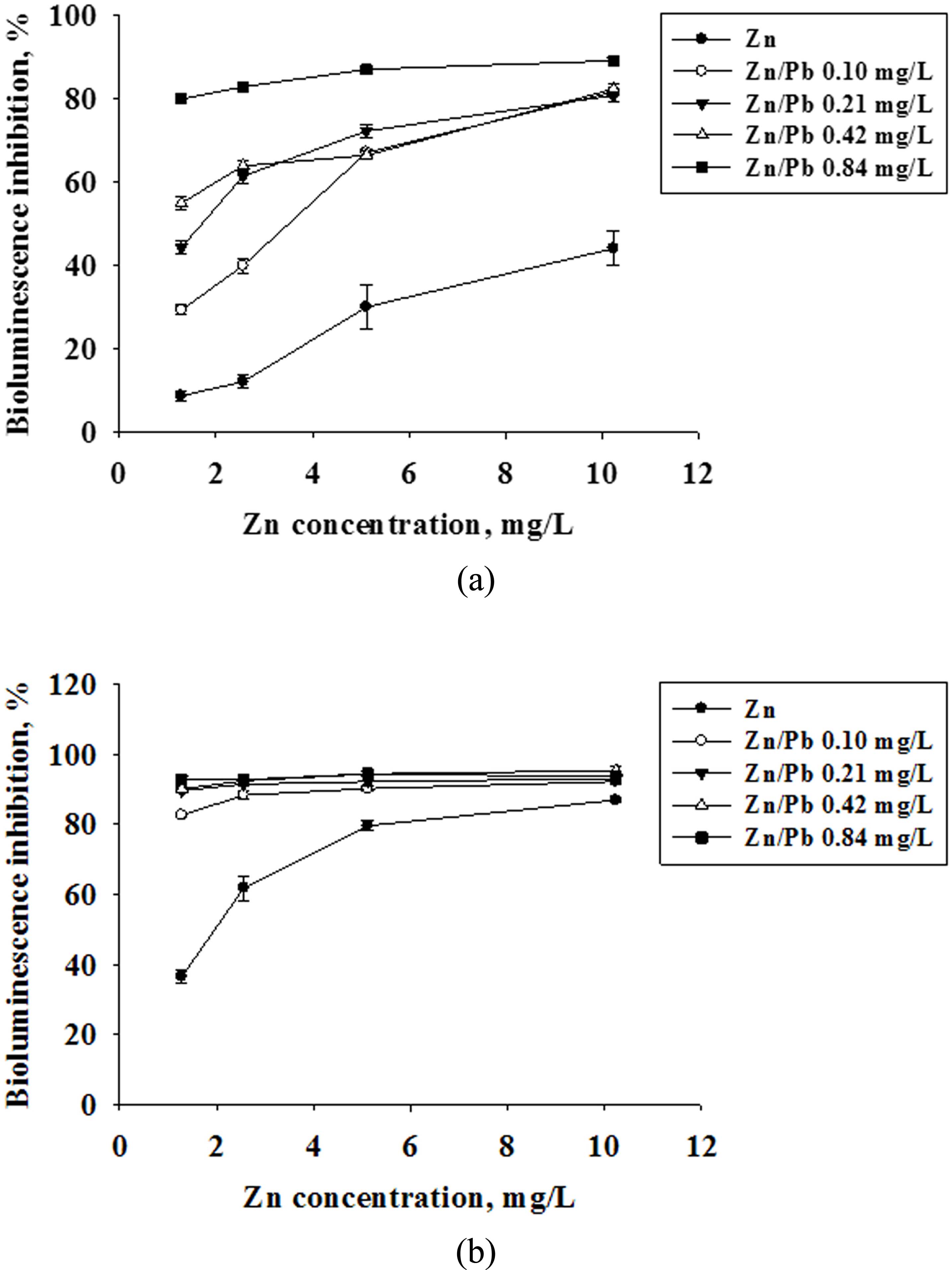 Figure 2. Comparison of dose response curves for Zn and Zn/Pb mixture solutions after (a) 5 min and (b) 15 min. Error bars indicate the 95% confidence intervals.
