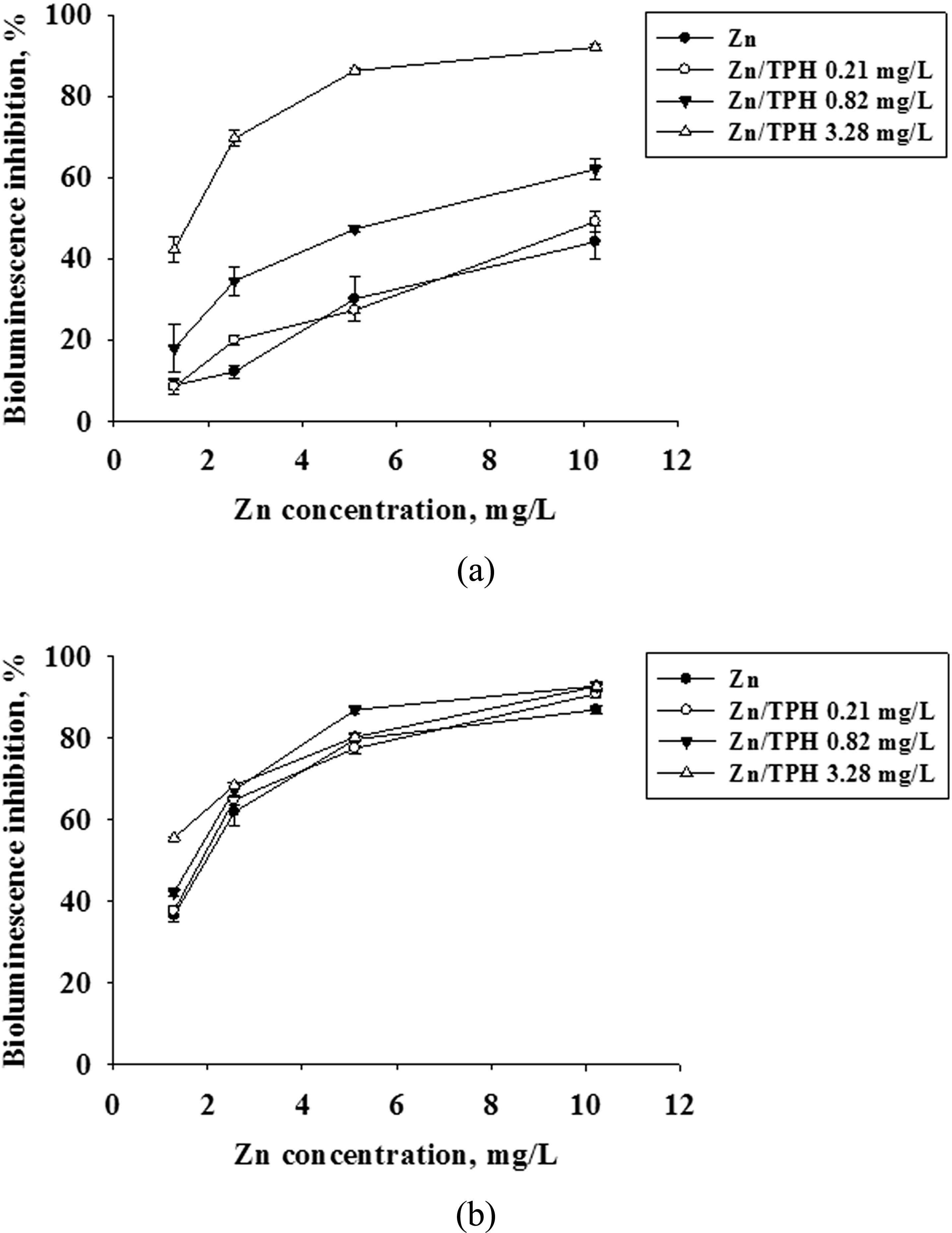 Figure 3. Comparison of dose response curves for Zn and Zn/TPH solutions after (a) 5 min and (b) 15 min. Error bars indicate the 95% confidence intervals.