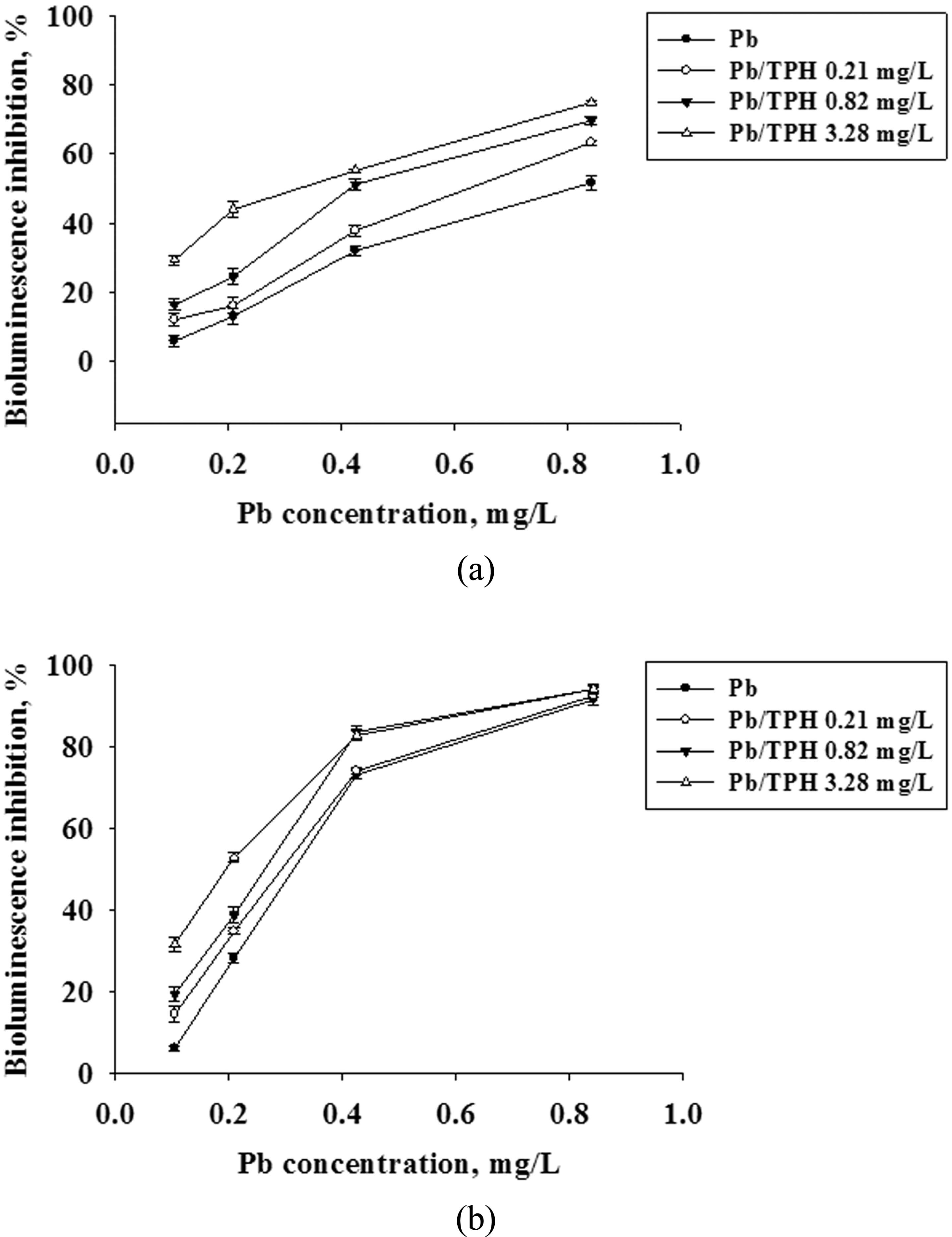 Figure 4. Comparison of dose response curves for Pb and Pb/TPH solutions after (a) 5 min and (b) 15 min. Error bars indicate the 95% confidence intervals.