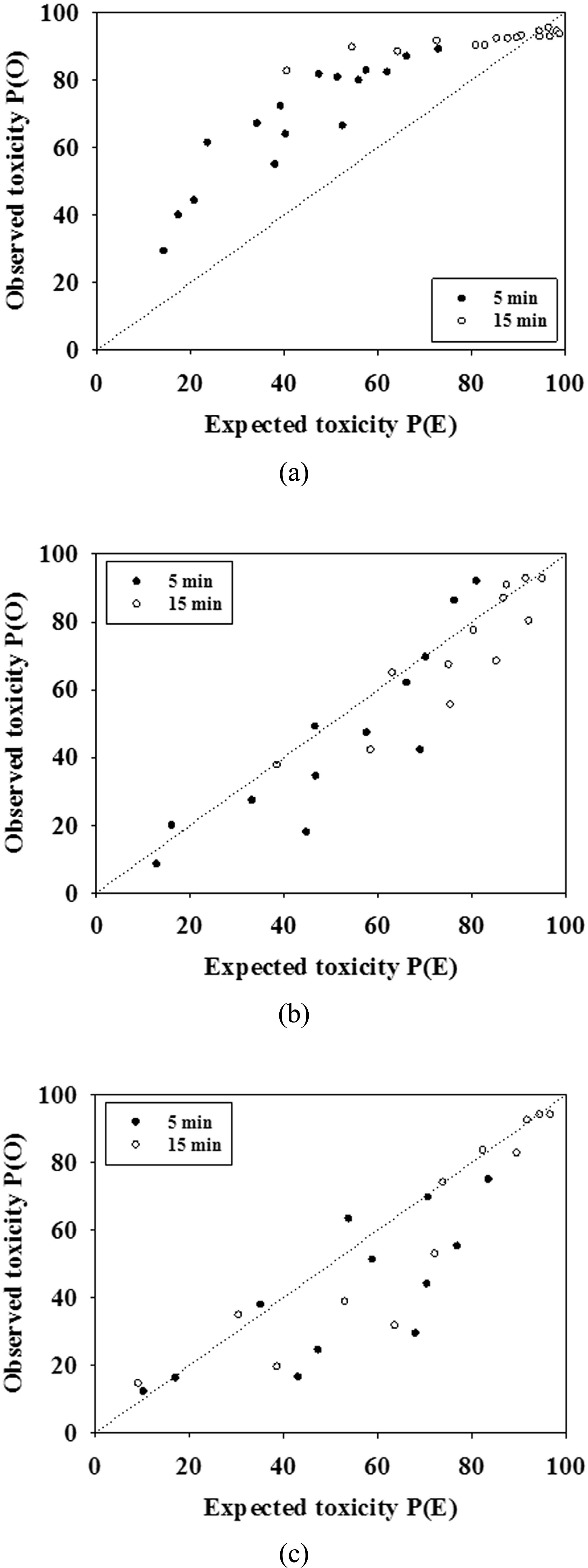 Fig. 5(a)에서 보이듯이 Zn과 Pb의 혼합 물질 독성영향에 서는 대부분이 실제 실험에서 나온 독성(P(O))이 예측한 독성(P(E))보다 높게 나타나며 이는
