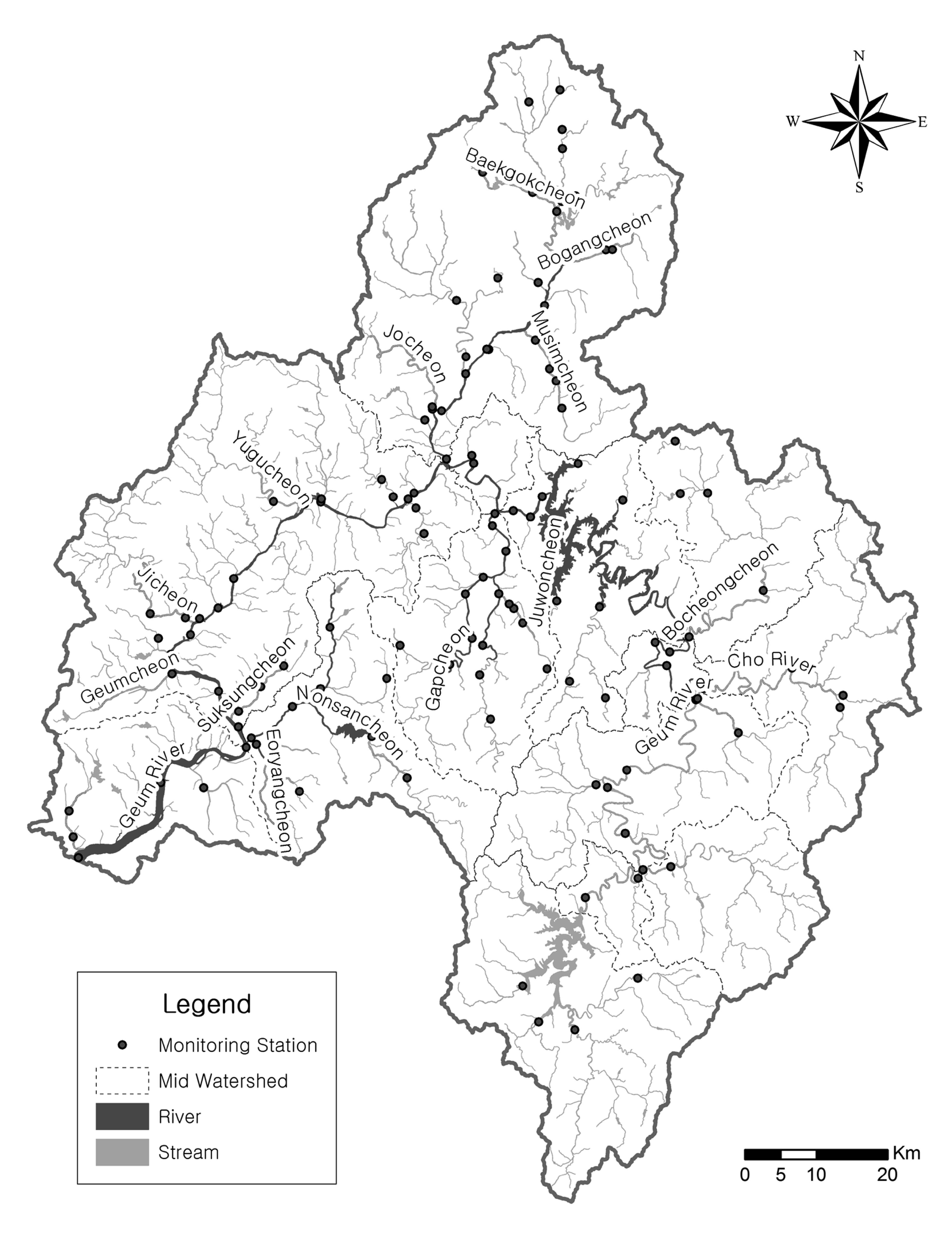 금강 유역은 전북 장수군에서 발원하여 대전, 공주, 부여 등을 경유하여 군산만으로 흘러드는 강으로, 그 유역면적은 9,914.01km2로서 우리나라에서 3번째로 큰 유역이다. 기후 는 한반도의 중서부에 위치하여 온대북한계에 가까워 유역의 평균기온은 11.0 ~ 12.5°C이고, 연강수량은 1,100 ~ 1,300mm 이나, 지형 등의 요인에 의해 국지적인 변화가 크다(Geum River Basin Environmental Office, 2014). 본 연구에서 대 상으로 하고 있는 금강 유역의 62개의 본류 및 지류의 수 질측정지점을 상·하류로 구분하여 Fig. 1에 나타내었다.