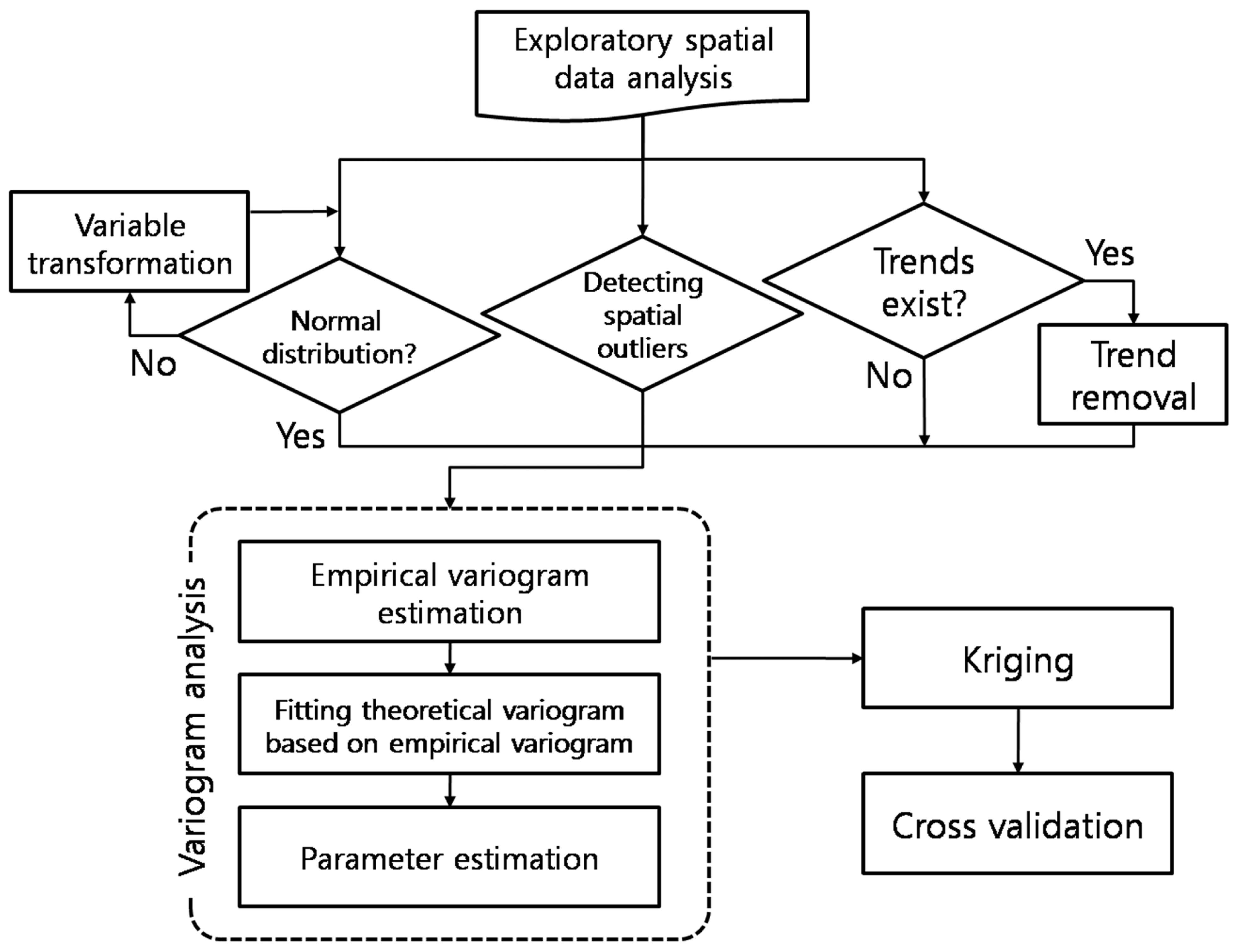 이와 같이 공간 자료에 대한 베리오그램의 추정, 추정된 베리오그램을 통한 최적 모형 선택, 선택된 베리오그램을 이용한 공간예측의 단계로 이루어져 있으며 공간분석에 대 한 순서도는 Fig. 2와 같다.
