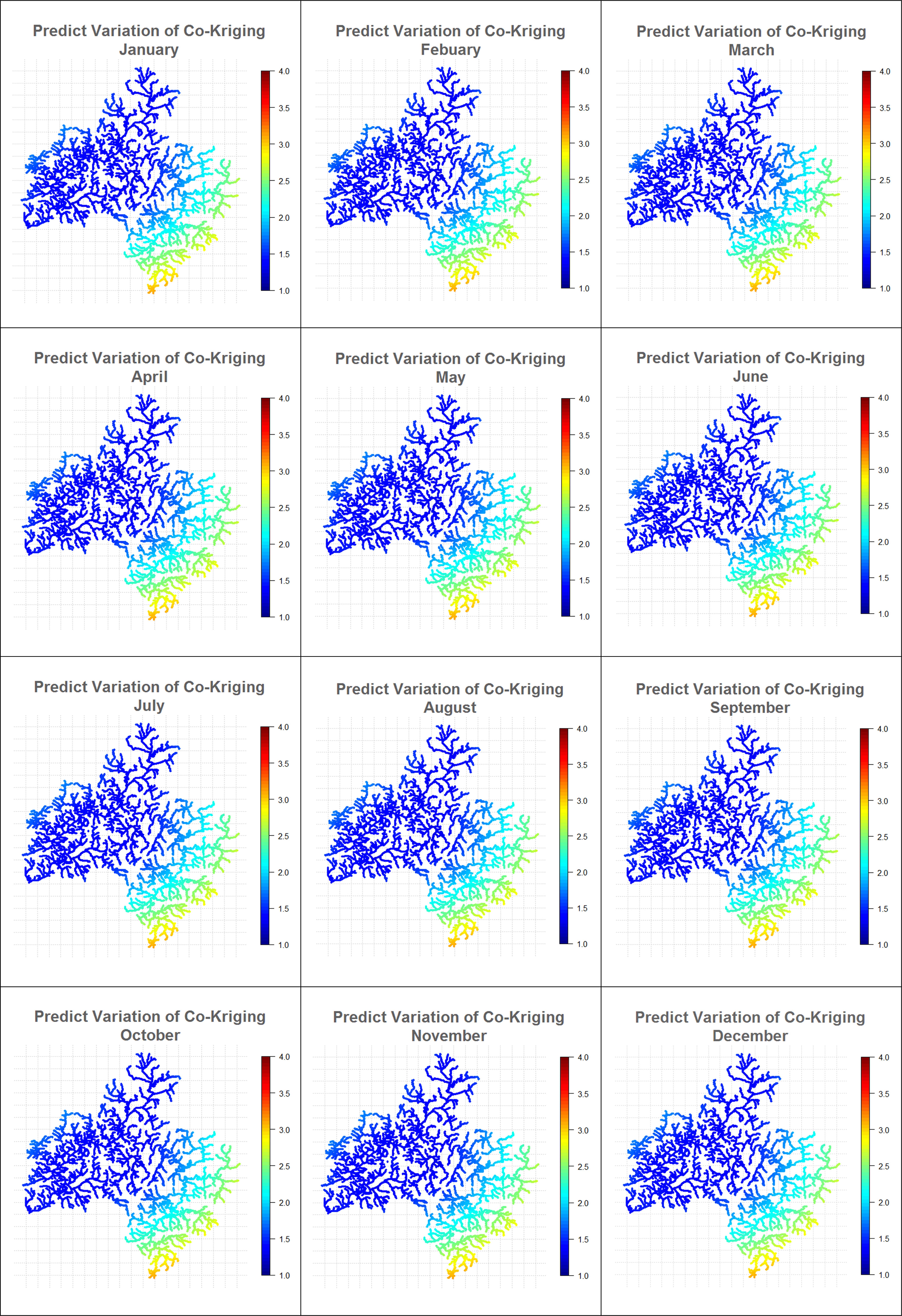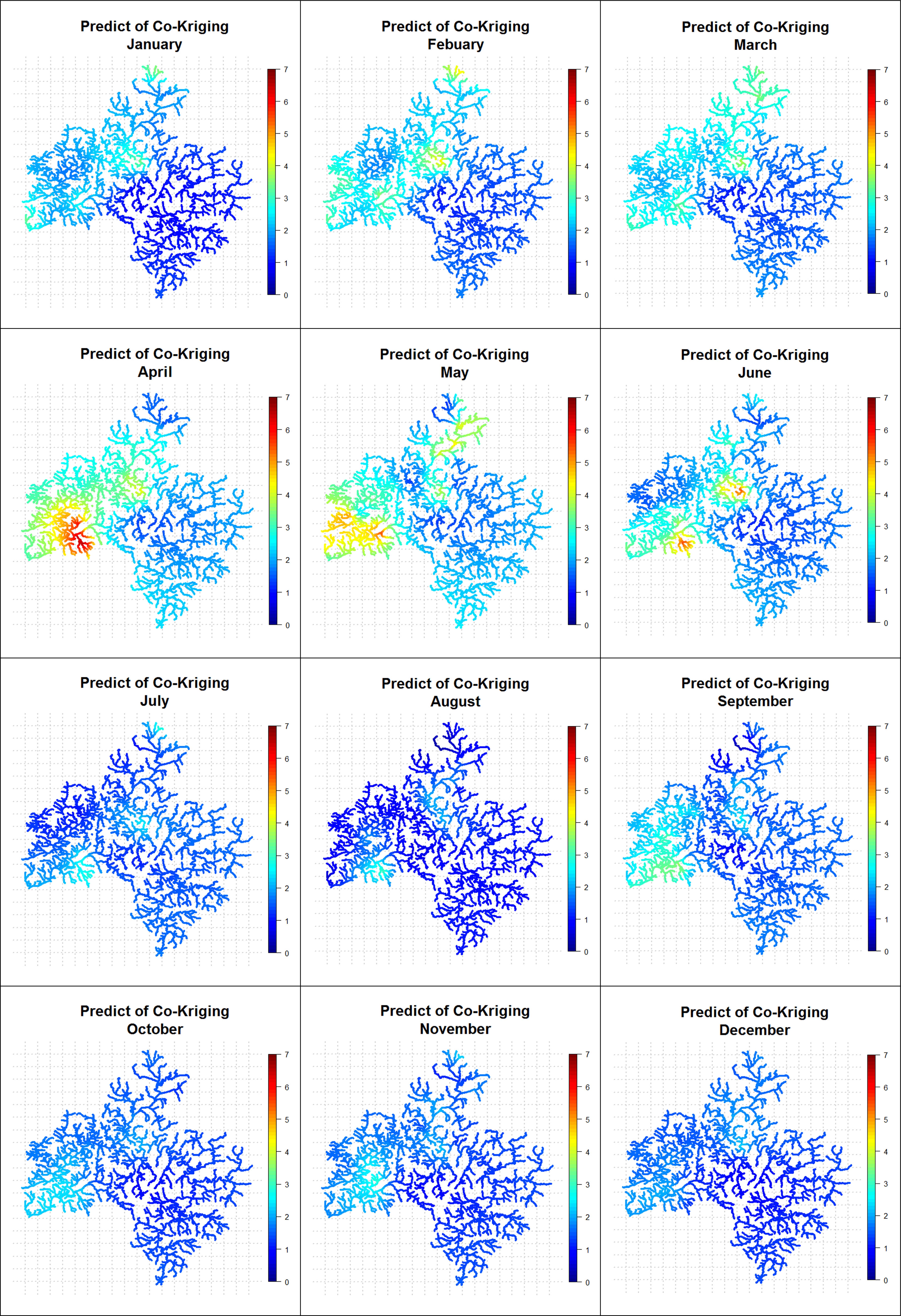 베리오그램 분석을 통해 최적의 베리오그램 모형 선택과 모수 추정 후 두 가지 방법의 크리깅을 통해 공간예측에 대한 성능을 비교한 결과 범용크리깅에 비해 공동크리깅 방법이 공간예측력이 더 우수한 것으로 확인되었다. 따라서 미관측 지점의 예측 값을 지도상에 표출하기 위해 각 월별 로 가중최소제곱추정방법으로 적합 시킨 후 최적의 베리오 그램을 선택하여 공동크리깅을 실시하였으며, 격자 공간상 에서 예측 값과 예측 값의 불확실성을 Fig. 3과 같이 표출 하였다. Fig. 3에서 보는 바와 같이 각 월별 BOD의 공간 예측 값이 공간적으로 비균질하다는 것을 알 수 있다. 이 러한 공간적 비균질성은 수질오염원의 위치, 토지이용 패 턴, 수리수문학적 특성, 하천 유형, 강우 특성 등 다양한 요인에 기인할 수 있다(Tu, 2011). 금강 유역 전체적으로는 상류부보다는 하류부에서 높은 BOD값의 공간적 분포를 보 이며, 특히 4월 ~ 6월의 경우 금강 하구 근처에서 BOD값이 높게 분포함을 관찰할 수 있었다. Fig. 4는 예측 값의 불확 실성을 나타내는 그림으로 예측된 값의 분산을 그림으로 나타내었으며, 각 월별로 예측 값에 대한 불확실성은 매우 비슷한 것으로 판단되었다.