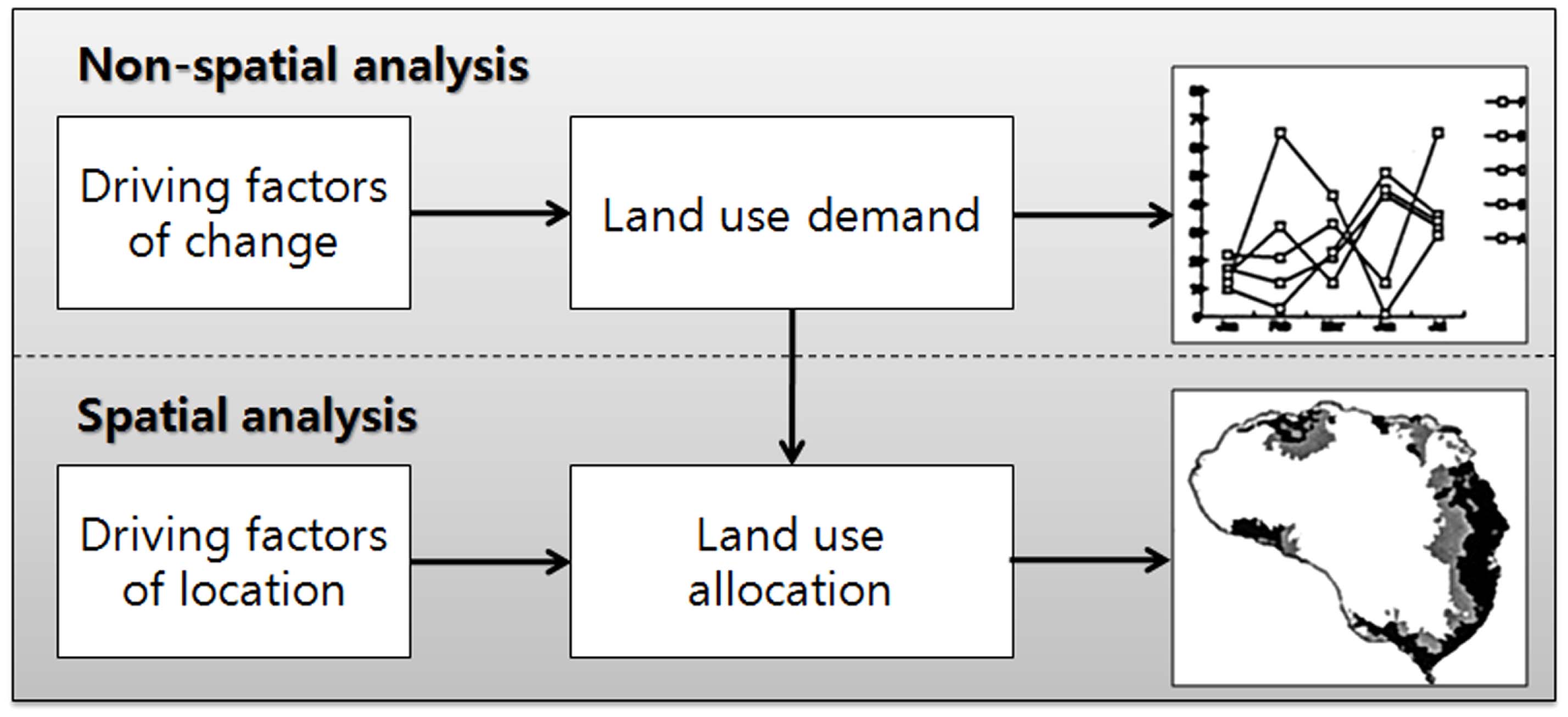 ClUE-S 모델은 비 공간적 모듈과 공간적 모듈로 구성되 어 있으며(Fig. 2) 비 공간적 모듈은 총괄적으로 모든 토지 이용 유형에 대한 지역의 변화를 계산하고 공간적 모듈에 서 이를 레스터자료 기반 시스템을 사용하여 연구지역