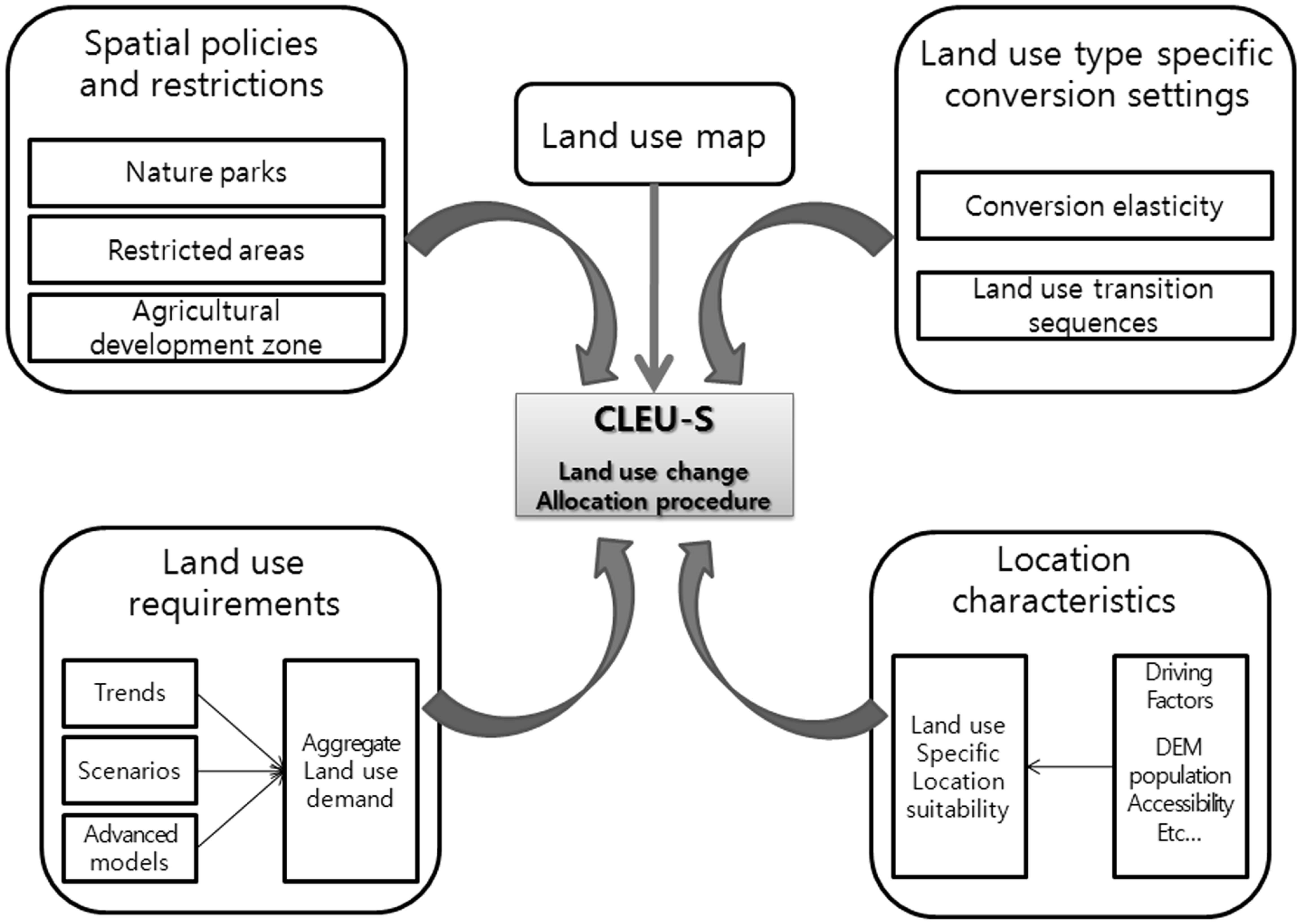 CLUE(Conversion of Land Use and its Effects modeling framework; Veldkamp and Fresco, 1996; Verburg et al., 1999) 모델은 토지이용 간 동적 모델링과 토지이용과 토지 이용의 변화요소(Driving Factor) 간 경험적 정량화를 이용 한 토지이용 변화를 모의하기