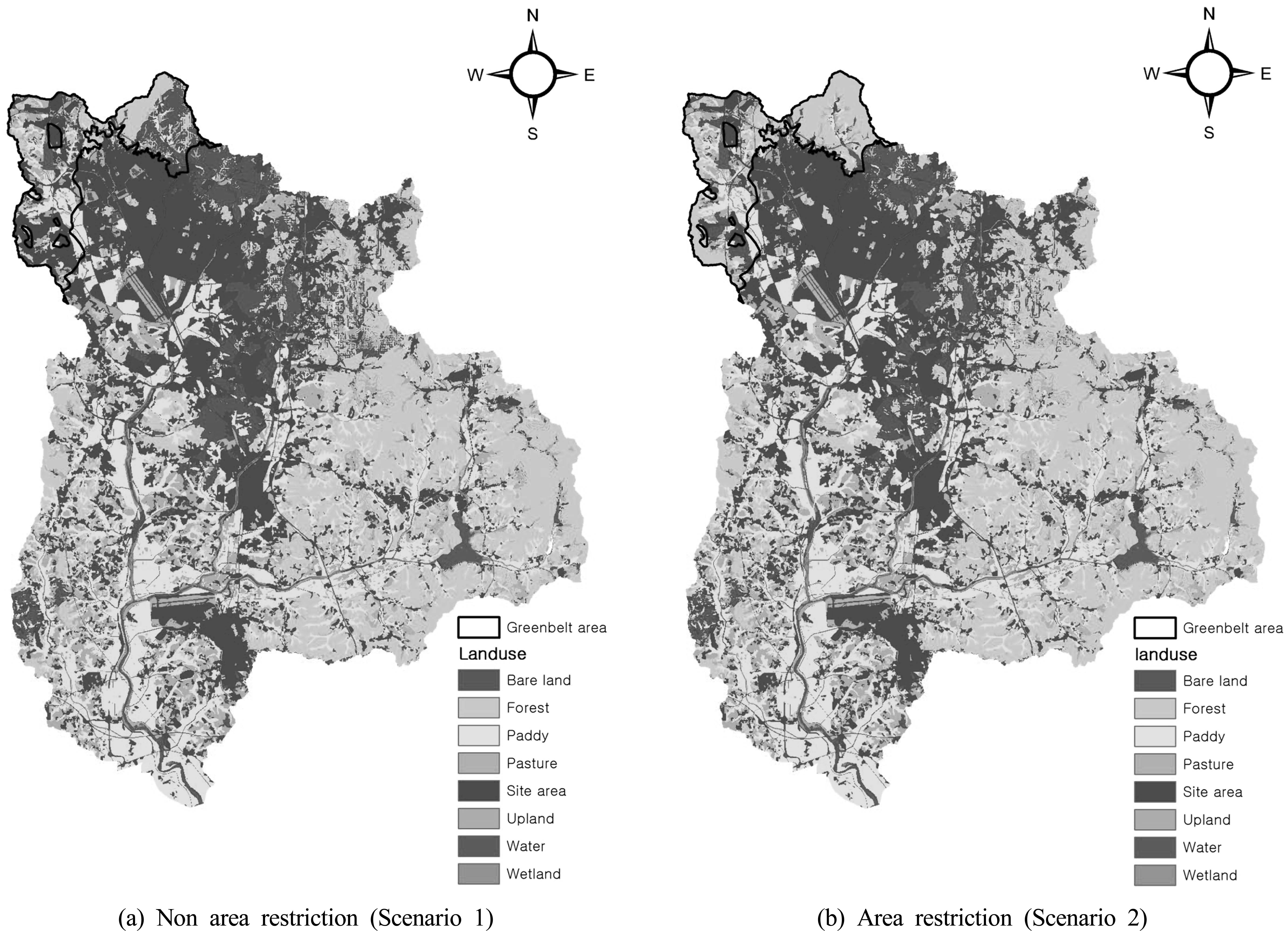 하지만 그린벨트 지역을 적용한 시나리오 2에서는 그린 벨트 지역 내 산림이 개간되고 대지가 증가하는 경향이 나 타나지 않았고 이에 따라 그린벨트 지역