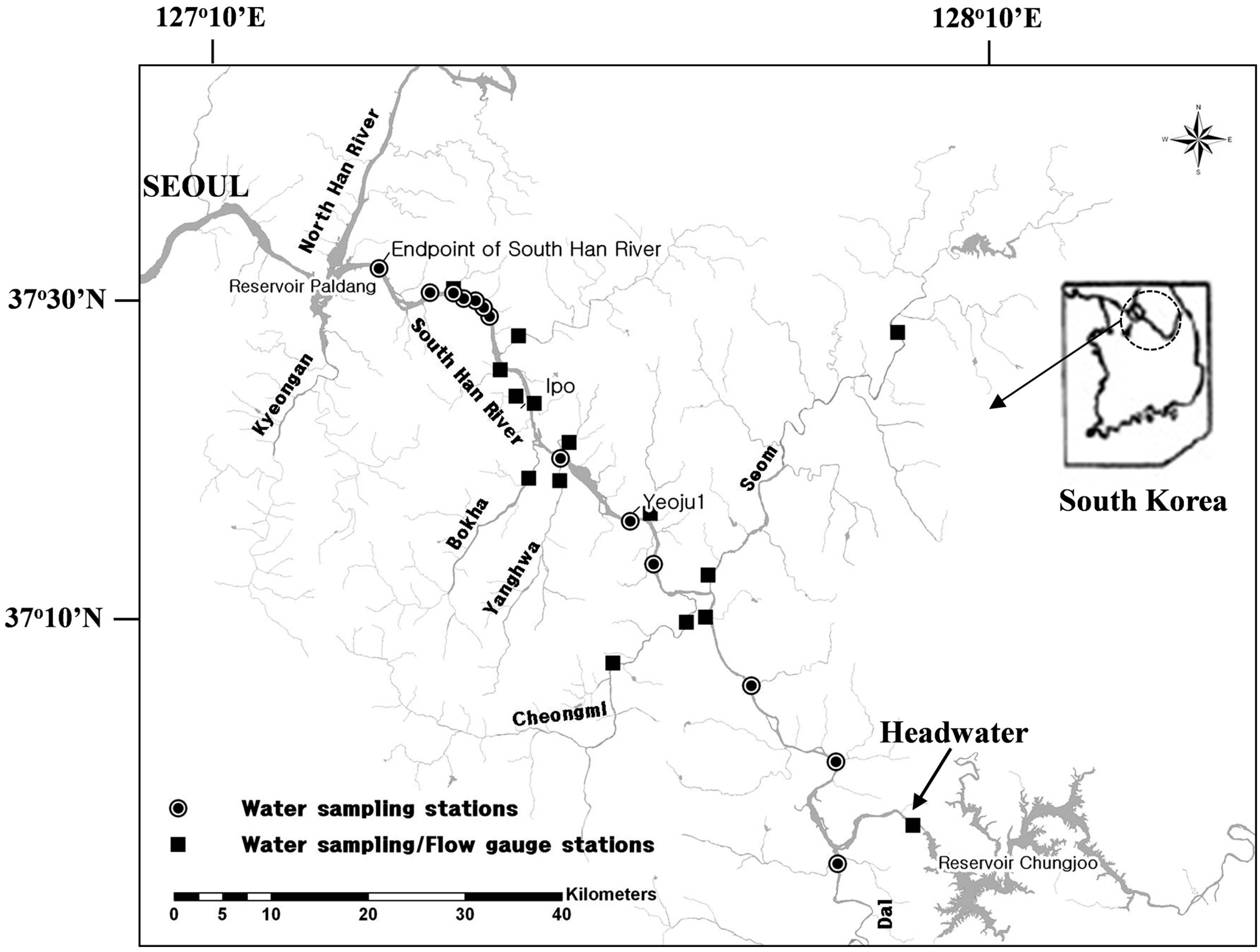 Figure 1. Map showing water sampling stations (◉) and water sampling/flow gauge stations (■) in the South Han River. (Modified fromKong et al., 2005)