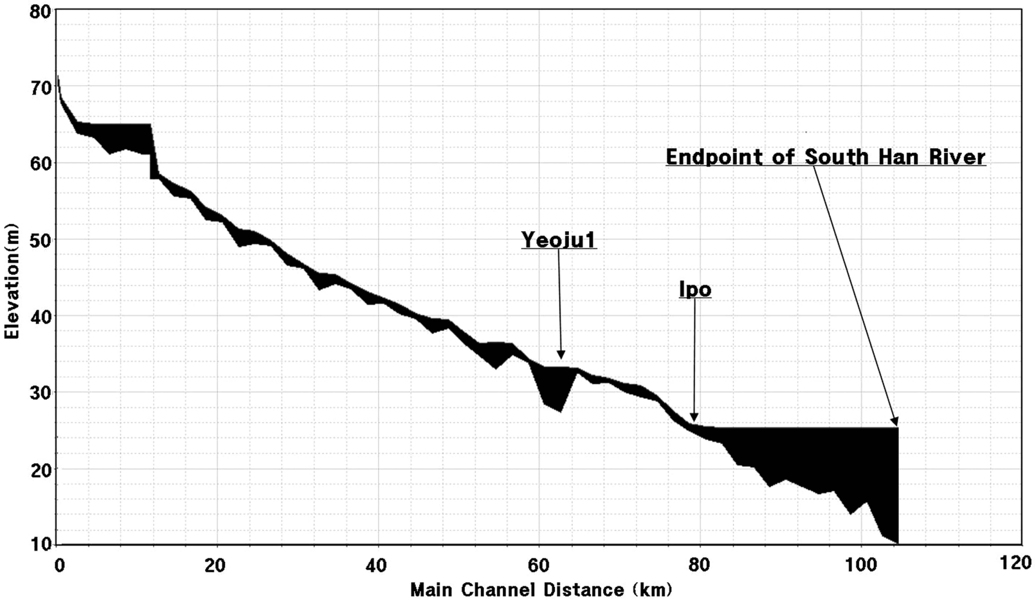 하천대와 전이대의 수심, 하폭, 체류시간은 서로 상이하 다. 4대강 사업 이전에 충주댐으로부터 이포 지점까지 약 80km는 하천의 형상을 지니고 있었고 그 하류에서는 급격 히 수심이 증가하는 형상이었다(Fig. 2). 이에 따라 2005년 과 2006년 봄철에 충주댐으로부터 이포 지점까지 유속은 0.5 m/s 내외였고 도달시간은 약 2일이었던 반면, 그 하류 20km 구간의 유속은 0.05~0.06 m/s 였고 체류시간은 3~4일 정도였다(Kong et al., 2006; Yoon, 2006).