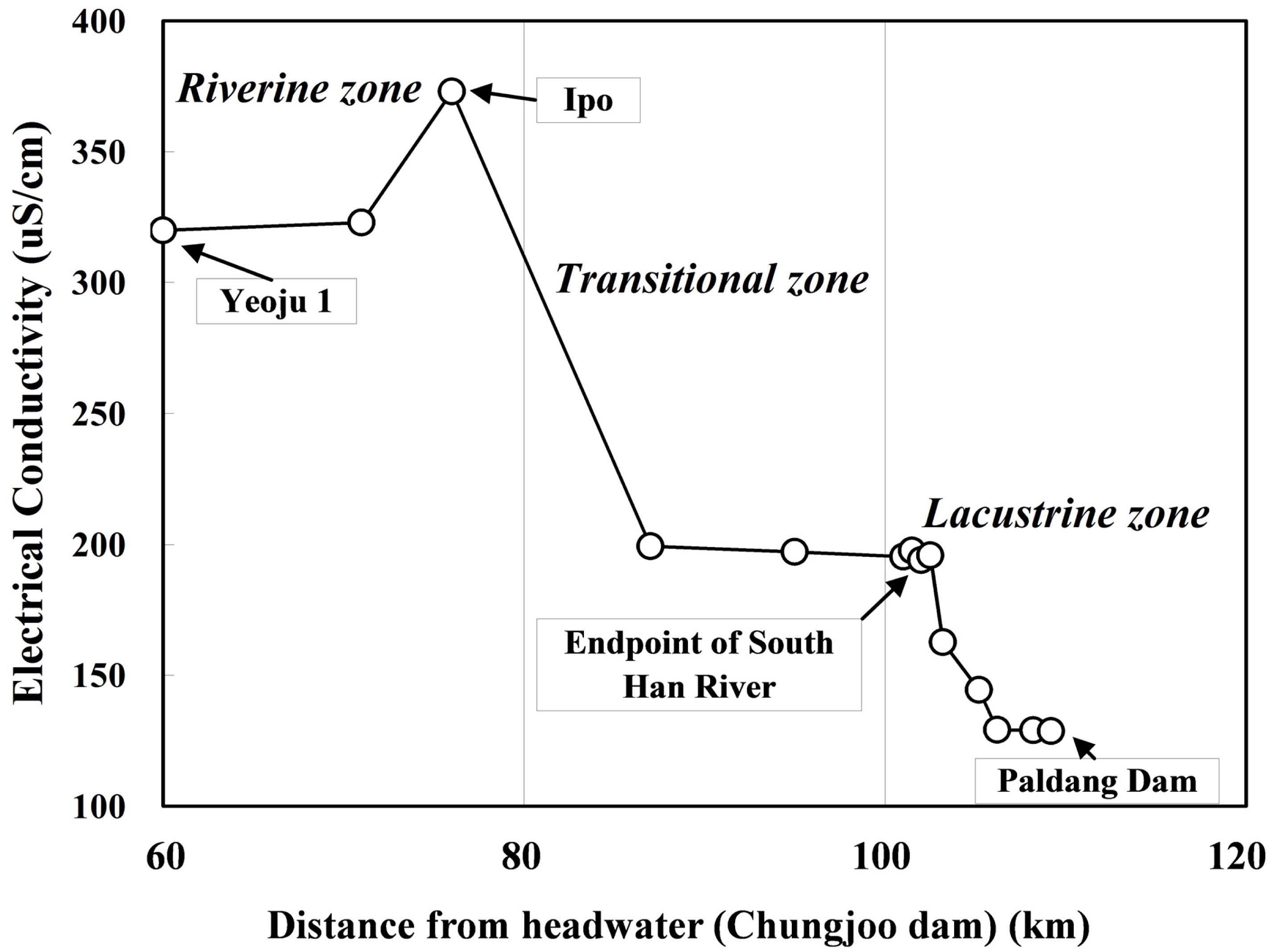 북한강의 전기전도도는 남한강에 비해 매우 낮으므로 남 한강의 전기전도도는 팔당호 유입부에 이르러 급속히 낮아 진다(Fig. 3). 2004년 12월의 측정치를 기준으로 충주댐으로 부터 이포 지점까지 약 80km의 전기전도도는 약 300 μS/cm 였으며, 이후 20km 구간은 약 200 μS/cm, 북한강과 합류되 는 호심부는 약 130 μS/cm로 감소하였다(Yoon, 2006).