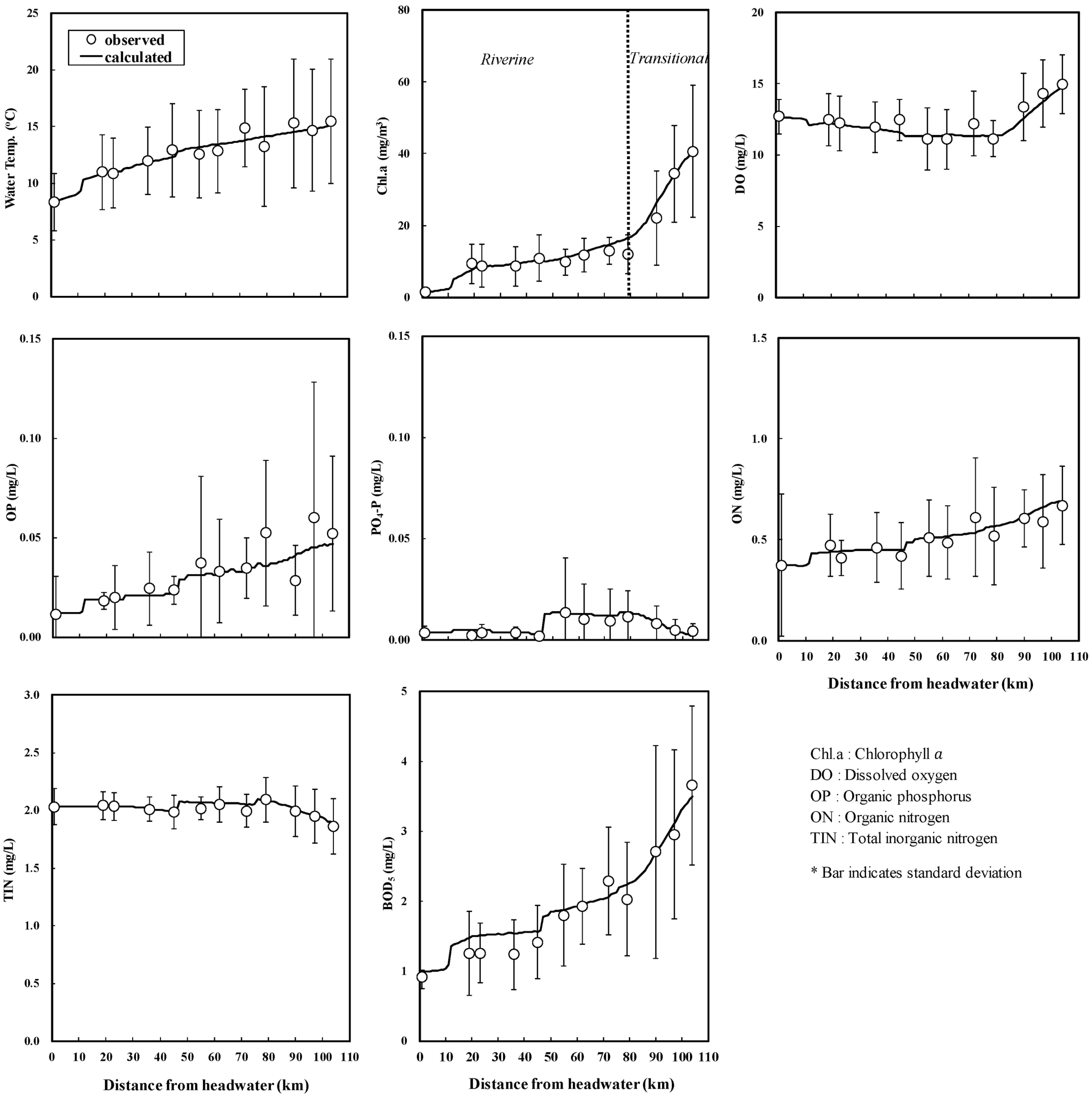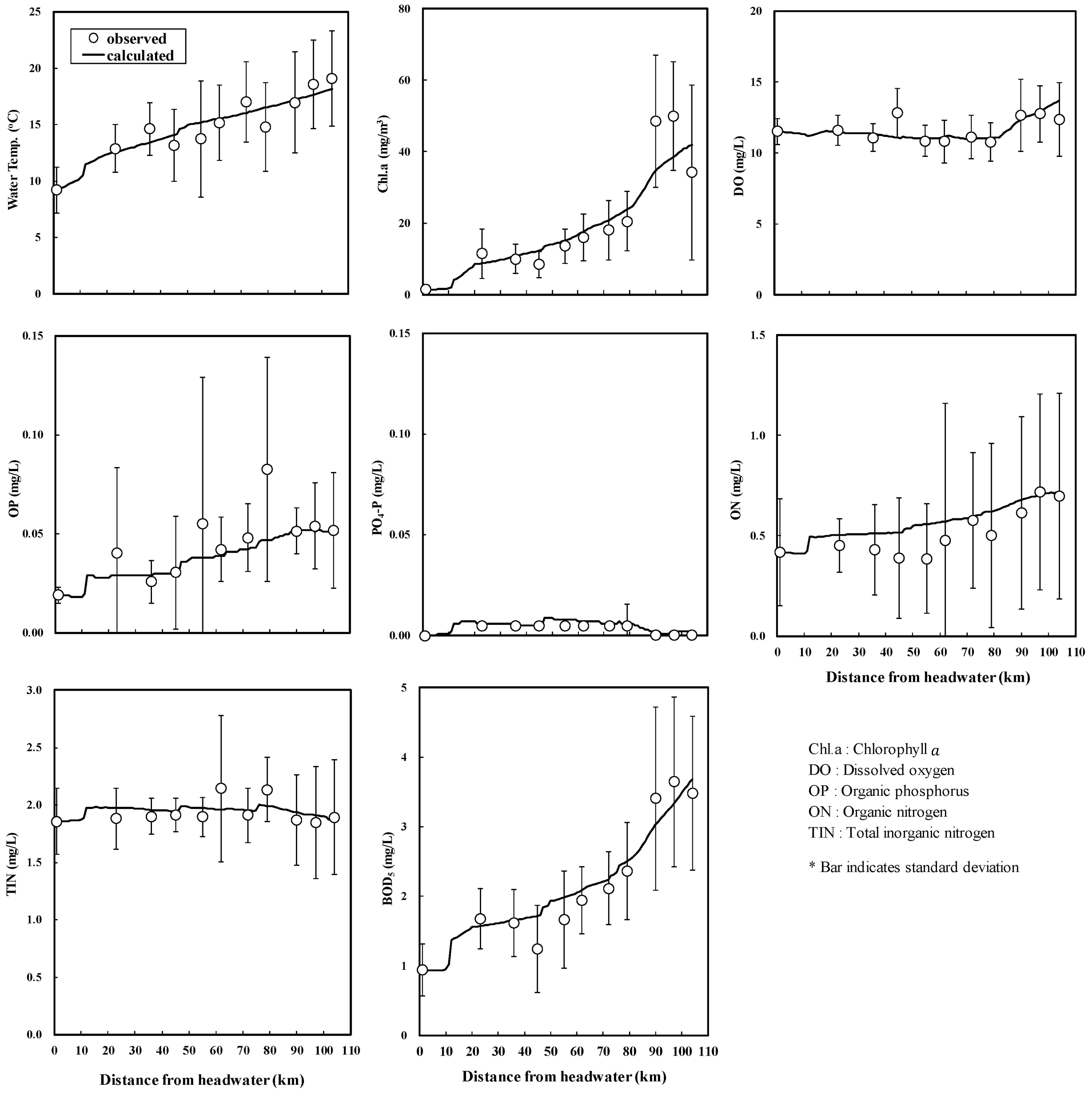 수온, 전기전도도, pH, 용존산소(dissolved oxygen, DO)는 YSI-6600(USA), BOD5는 DO meter를 사용한 격막 전극법, 유기탄소는 총 유기탄소 자동분석기(TOC Analyzer, Shimadzu) 로 측정된 것이다. 총인(total phosphorus, TP)과 총질소(total nitrogen, TN)는 각각 수질오염공정시험방법에 따라 흡광광 도계(cary 1E, Varian)로 측정된 것이다. 용존 총인과 용존 총질소는 GF/F 여과지로 여과 후 총인, 총질소와 같은 방법 으로 측정되었고, 여액 중 질산성 질소는 IC(Ion Chromatography, Dionex)로, 암모니아성 질소와 아질산성 질소 및 인 산염인은 흡광광도법으로 측정된 것이다. 클로로필 α는 GF/C 여과지로 여과 후 90% 아세톤으로 암냉소에서 24시간 동 안 엽록소를 추출하여 663, 645, 630, 750 nm의 파장에서 흡광광도계(cary 1E, Varian)로 측정된 것이다.
