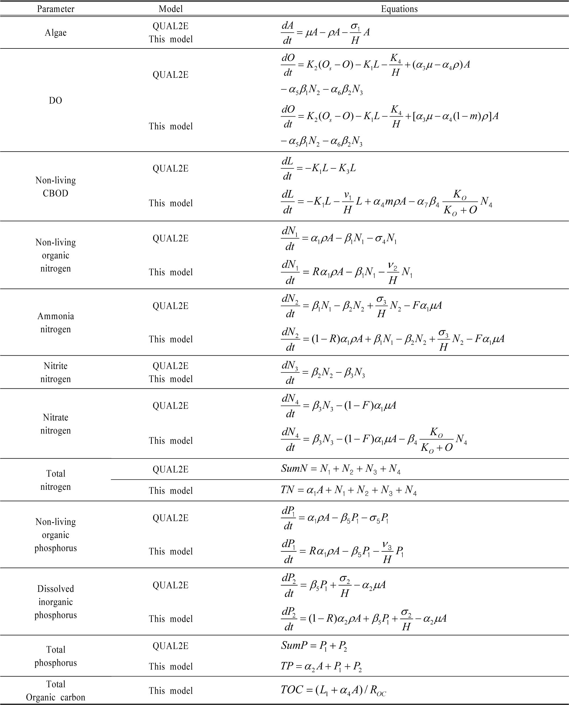 Table 2. Modified equations in this model compared with those in QUAL2E