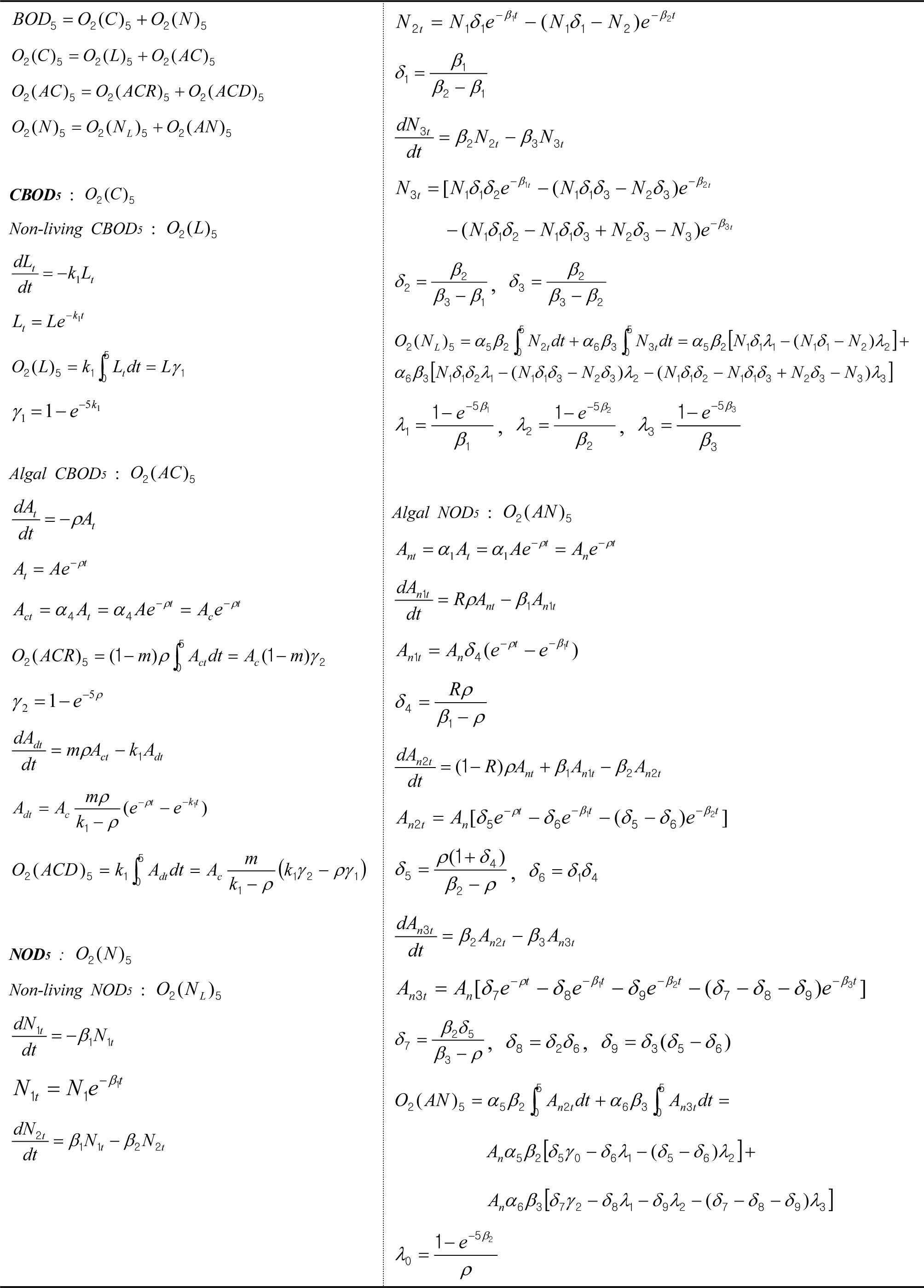 CBOD5는 비생물성[O2(L)5]과 조류성[O2(AC)5]으로, 조류 성[O2(AC)5]은 다시 호흡성[O2(ACR)5]과 사멸 또는 분비성 [O2(ACD)5]으로 분리하였다.