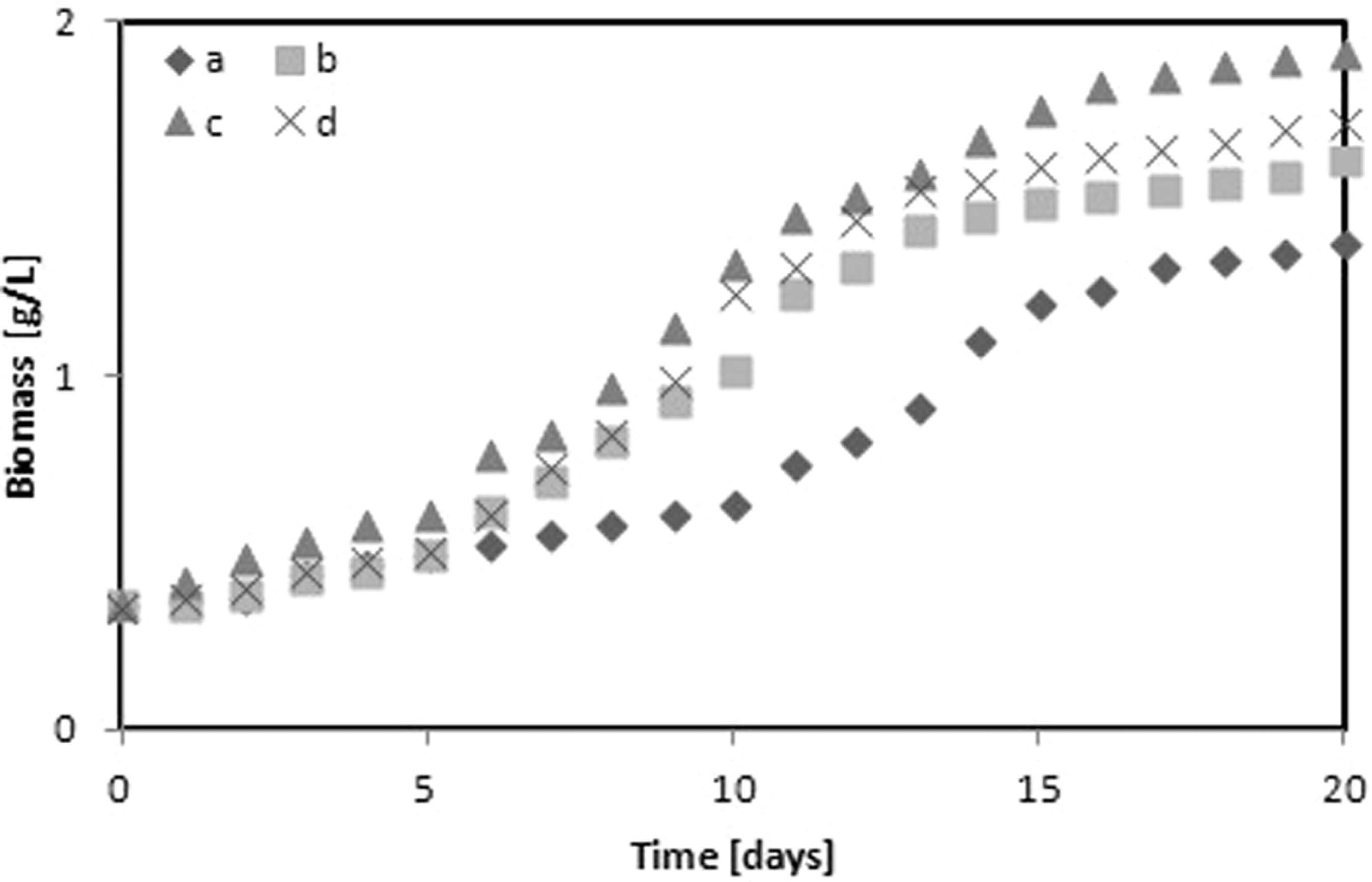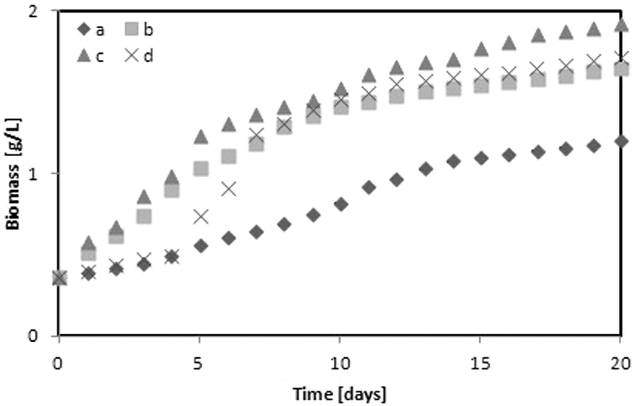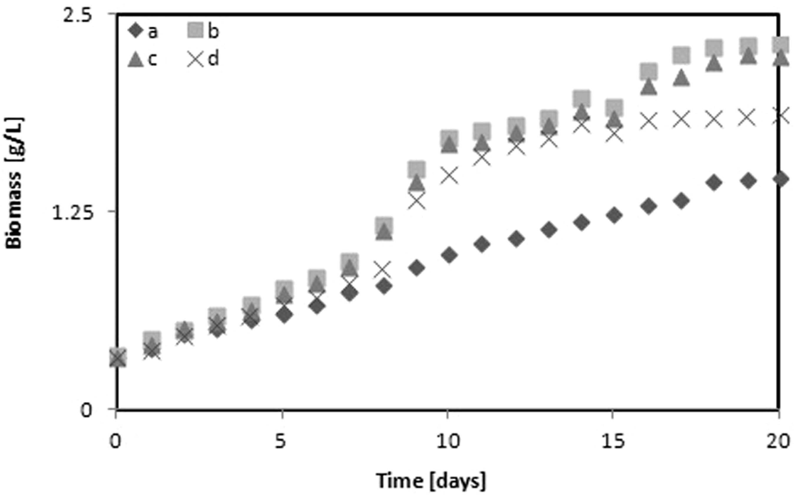 Fig. 2. Growth ofChlorellasp. at various glycerol concentrations (a: 0, b: 2, c: 5 and d: 10 g/L).