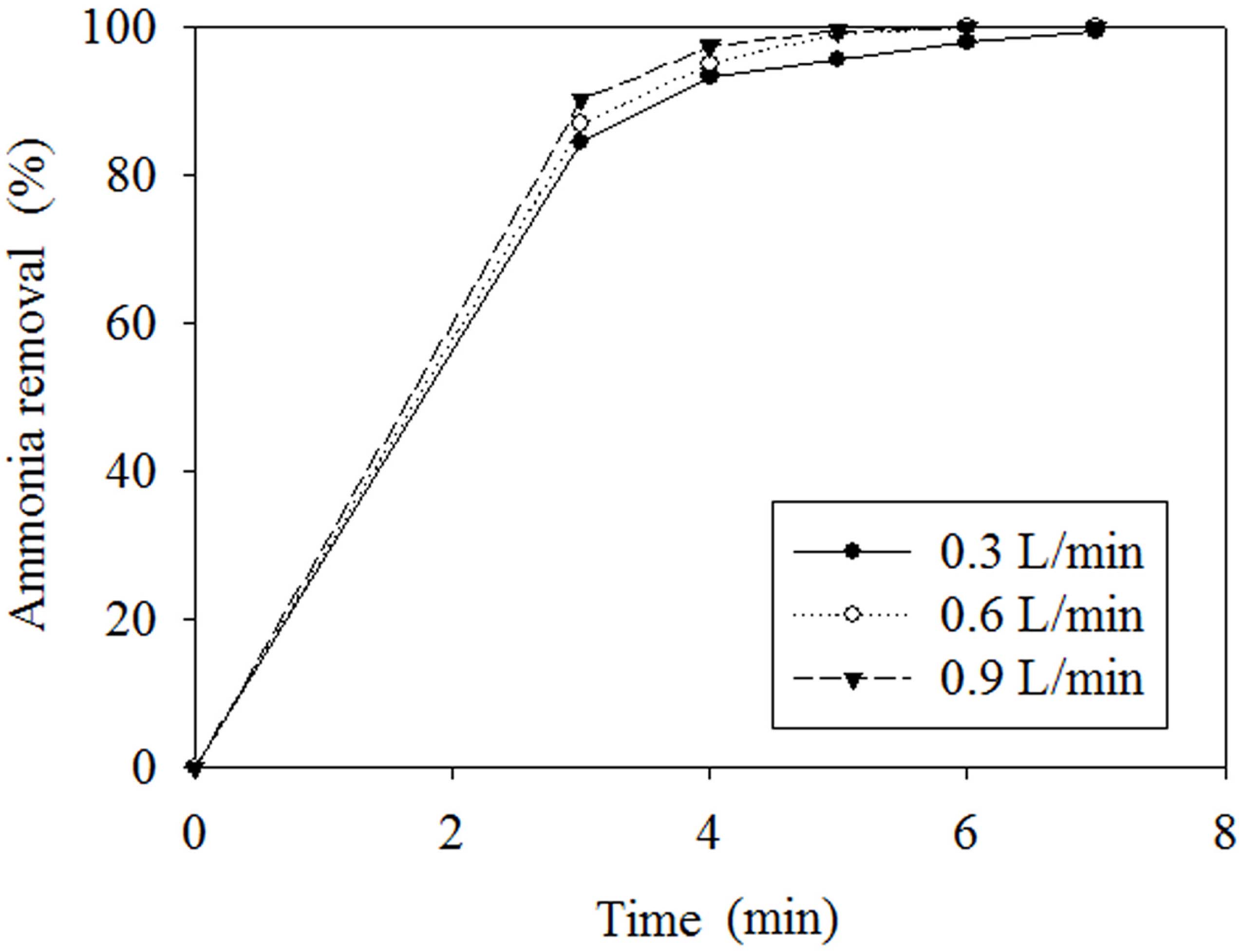 공기주입량에 따른 암모니아성질소 제거효율(조건 : 100°C, pH 11, 1,600 W)은 공기주입량을 0.3 ~ 0.9 L/min 증가시켜 조사시간