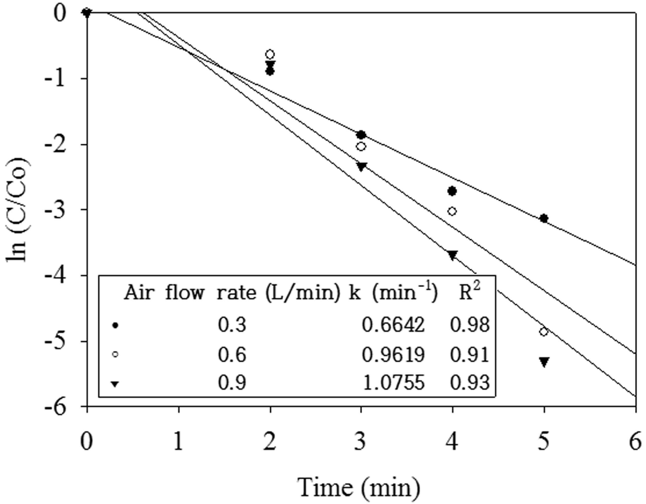 증가할수록 제거 효율이 증가하였다(Fig. 1). 공기주입량에 따른 제거효율은 조 사시간 3분에서 공기주입량 0.3 L/min에서 0.9 L/min로 증가 하였을 때 제거효율이 5.7% 증가하였지만