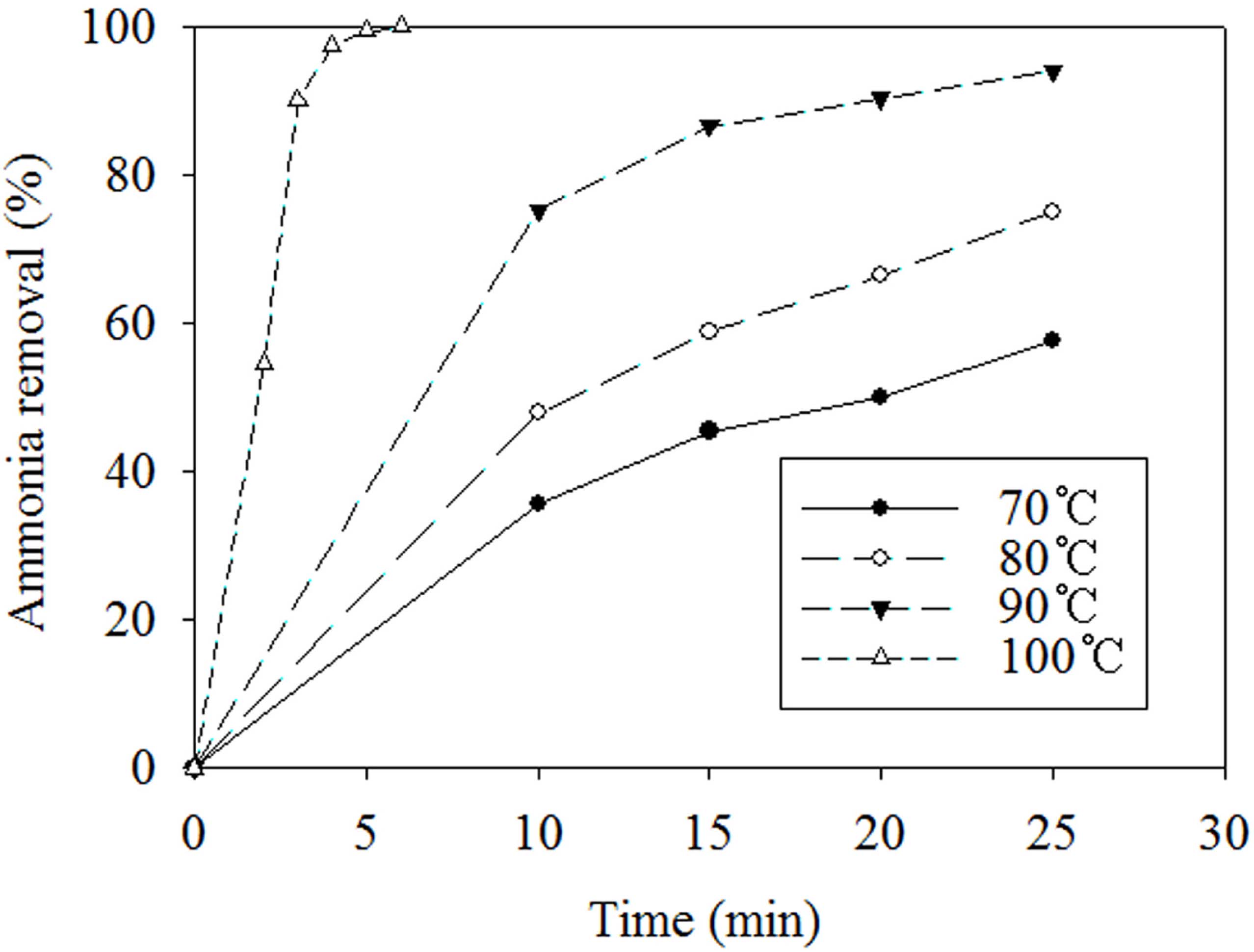 조사 온도가 90°C일 때는 94.2%의 암모니아성질소가 제거되었 다. 100°C의 경우 70, 80, 90°C와는 달리 5분 이내에 암모 니아성질소가