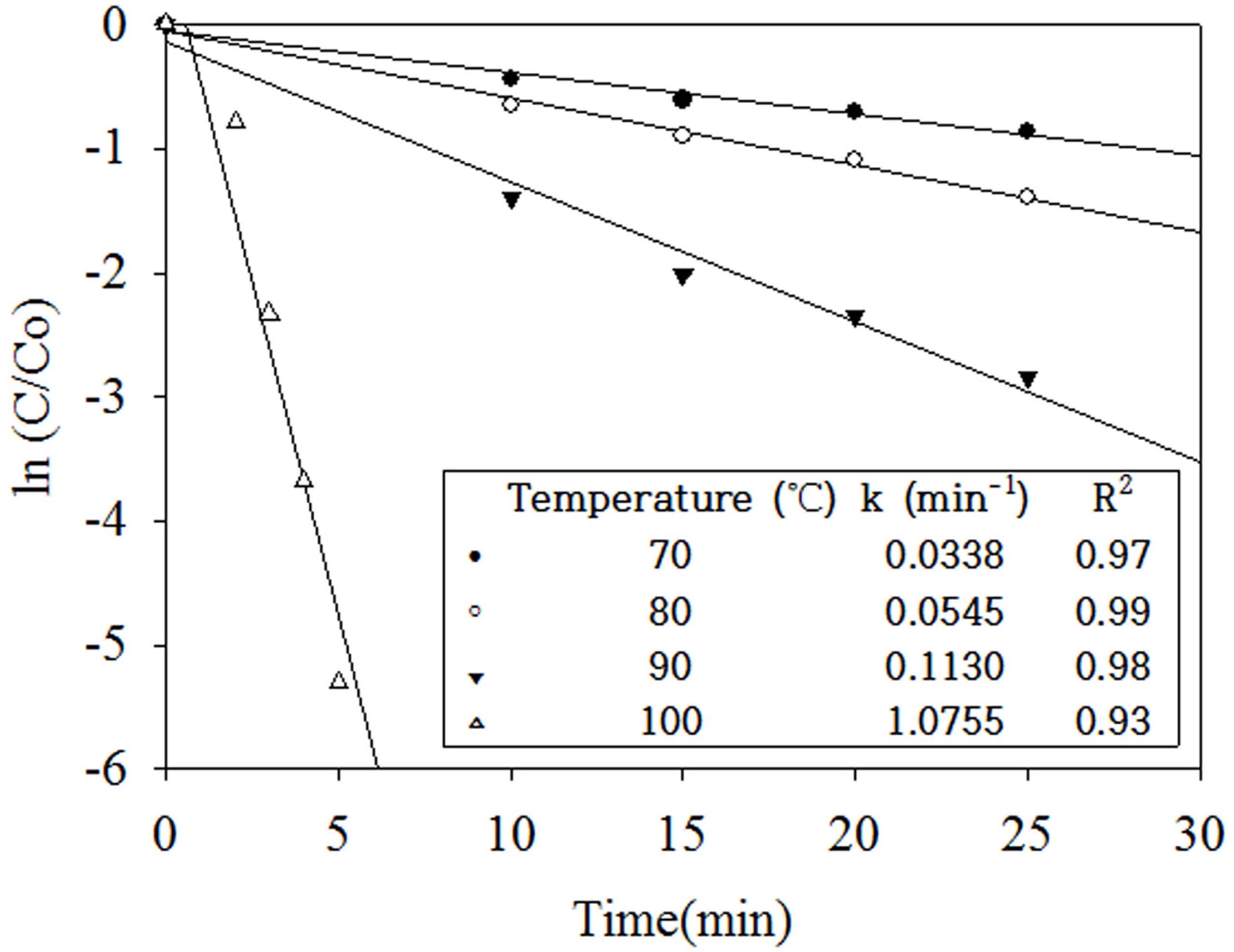 온도에 따른 암모니아성질소의 제거속도상수는 70°C에서 -0.0338 min-1 (R2=0.98), 80°C에서 -0.0545 min-1 (R2=0.99), 90°C에서 -0.1130 min-1 (R2=0.98), 100°C에서 -1.0755 min-1 (R2=0.98)이며 신뢰도는 모두 0.9이상으로 나타났다(Fig. 4). 조사온도 80°C에서 제거속도는 70°C에 비해 1.6배 증가하 였고, 90°C는 3배, 100°C에서는 제거속도가 약 28배 증가 하였다.
